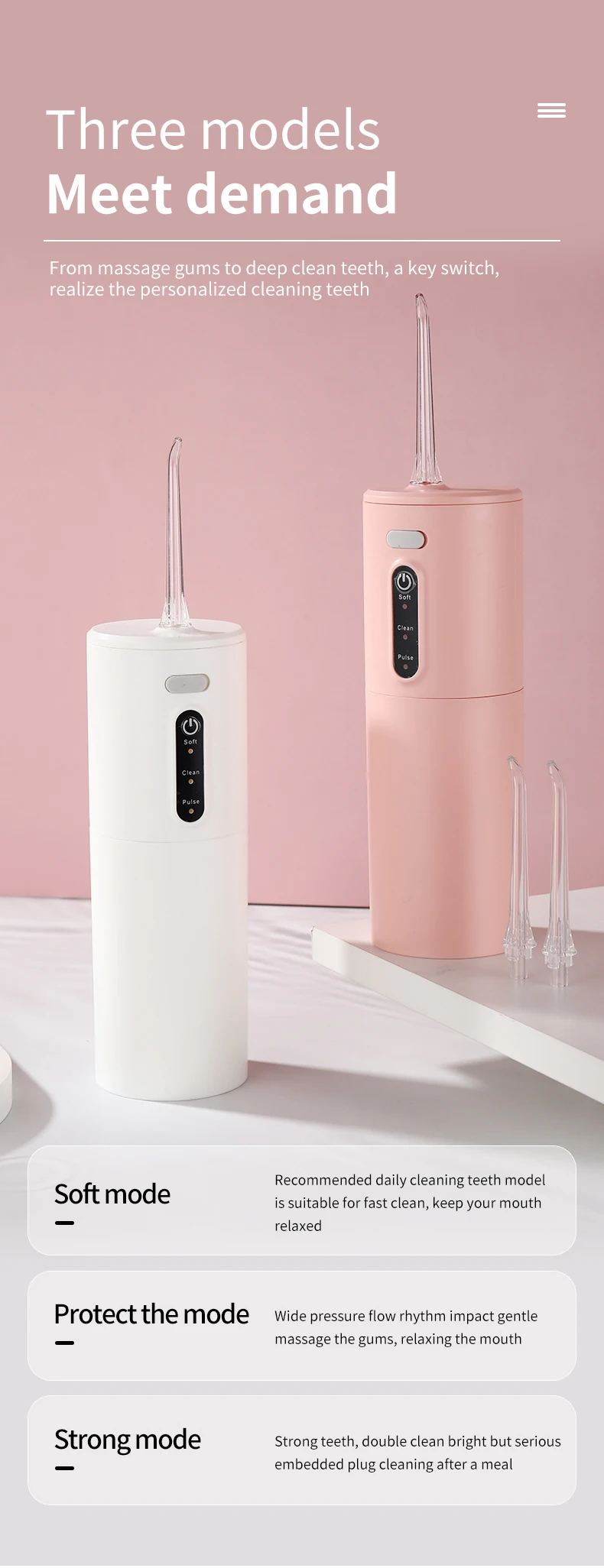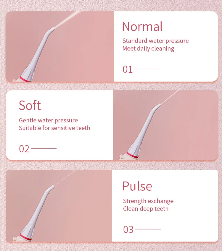 Выберите «нормальный» для мощного удаления частиц пищи, «мягкий» для нежной очистки чувствительных зубов, «Пульс» для массажа десен и полоскания.