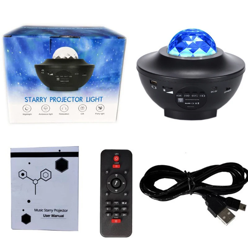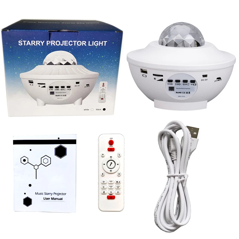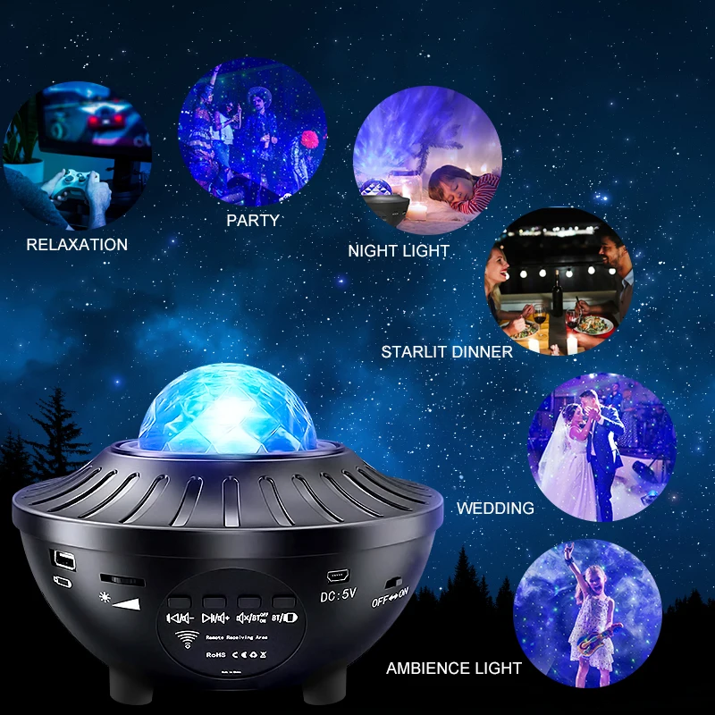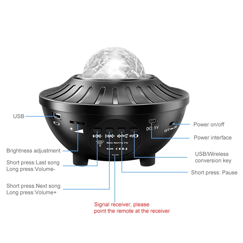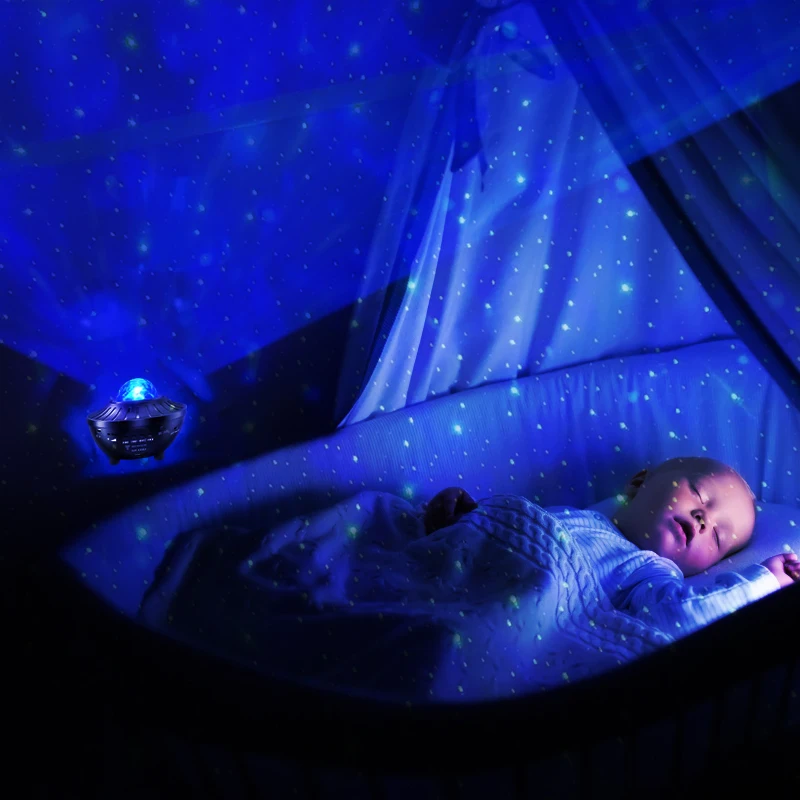 4. Работает со смартфонами через Bluetooth, вы можете наслаждаться музыкой, чтобы расслабиться, или воспроизводить звук сна, чтобы помочь вашему ребенку/детям спокойно спать. С уникальным звуковым режимом, свет мерцает и изменяет шаблоны с ритмом музыки, в результате чего происходит проекция звездного неба.