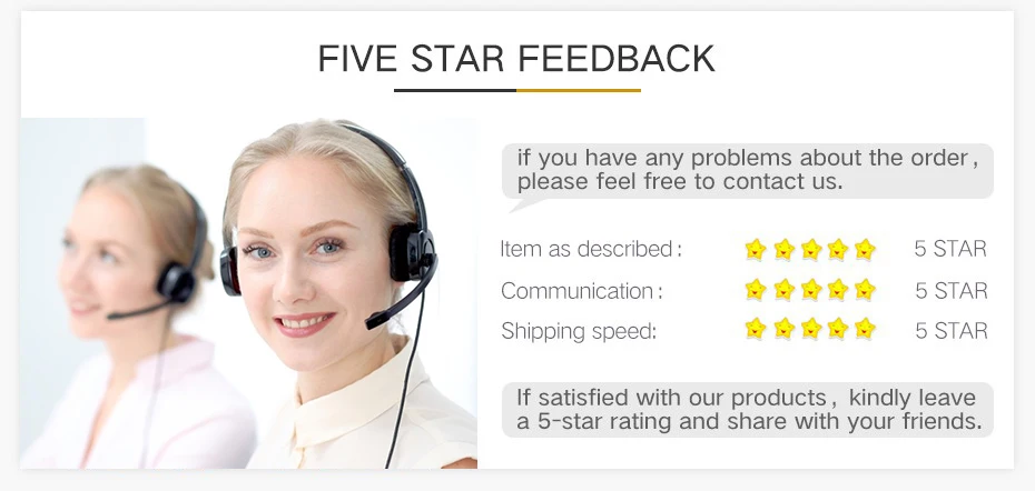 1. Ваше подтверждение будет высоко оценено после получения товаров. Как только вы получили товар, надеемся, что вы оставите нам положительный отзывы (4 или 5 звезд).