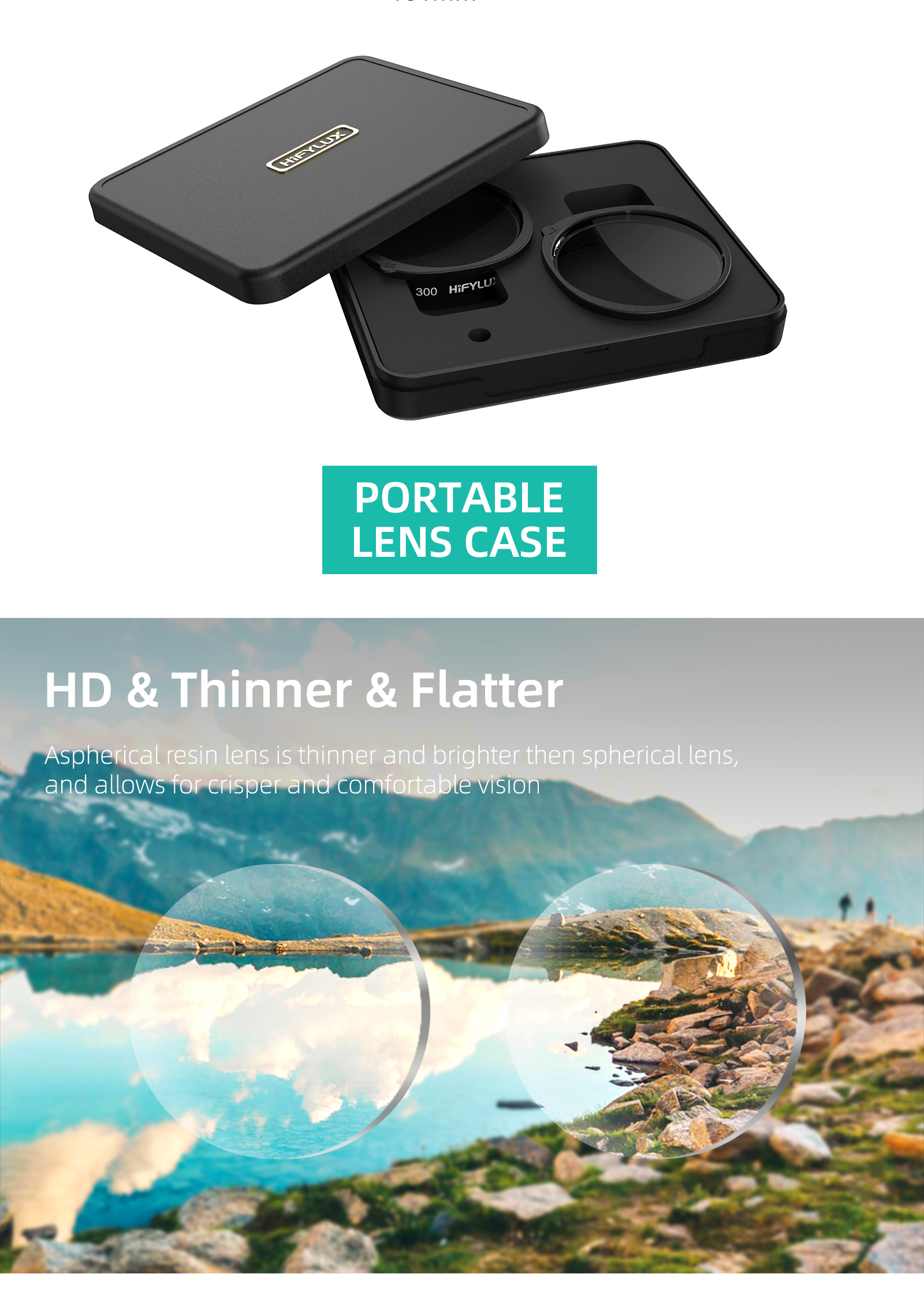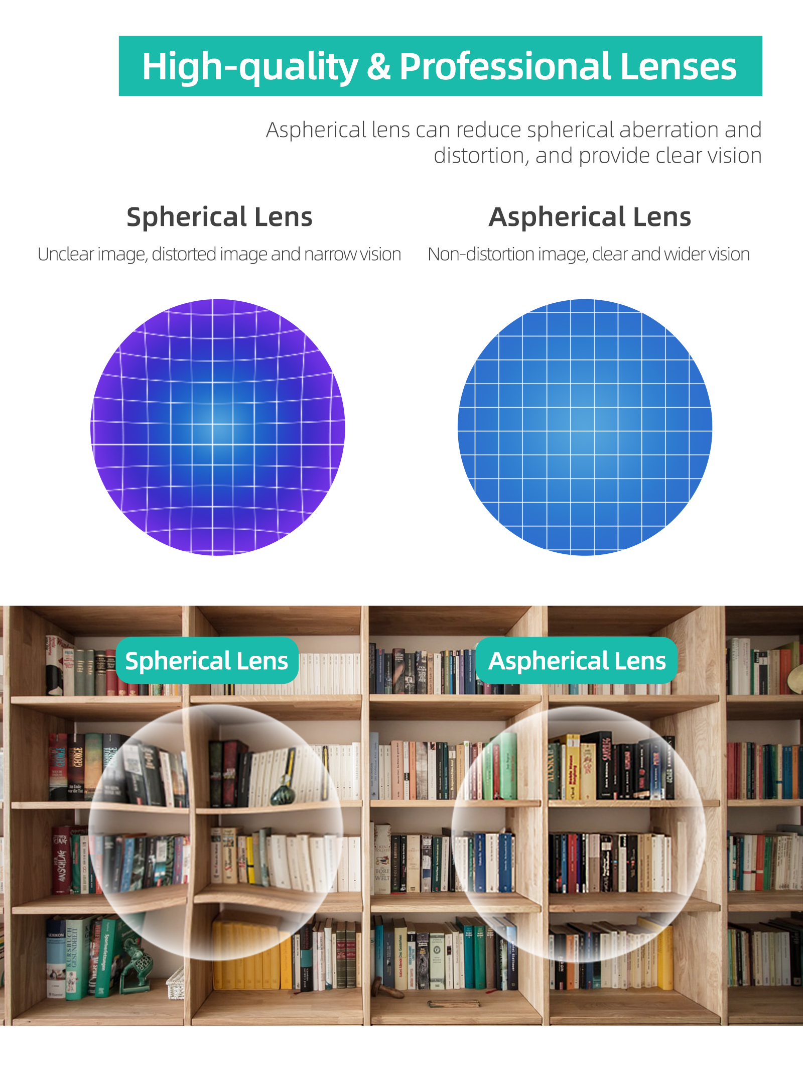 1. Асферические линзы из смолы: более тонкие и более полупрозрачные, чем сферические линзы, зрение реалистичное, и визуальный эффект более комфортный.