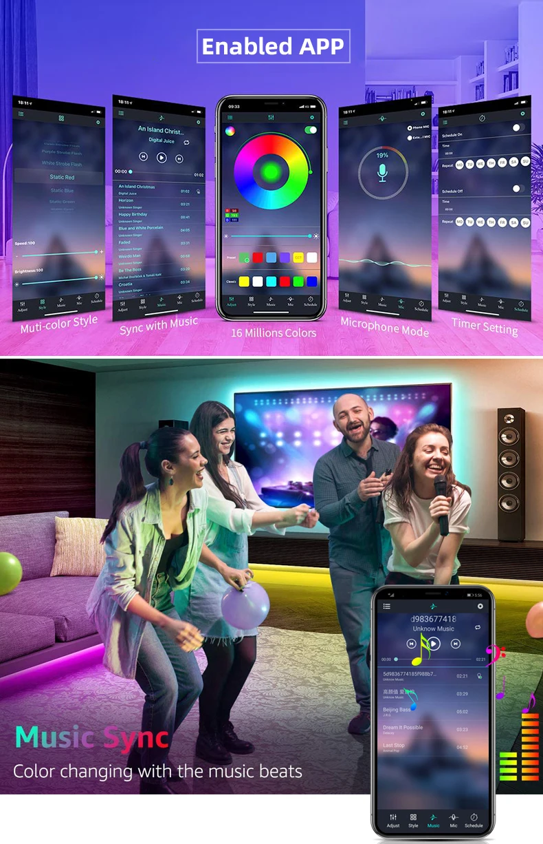【APP Control 】Controlling the LED strip lights via APP, remote control and controller. With the APP, you can freely choose to control 16 million colors. The bluetooth strip light has a smart music mode, which creating romance, relaxation, party ambiance with Music, lights color will change with the music beats or your microphone.