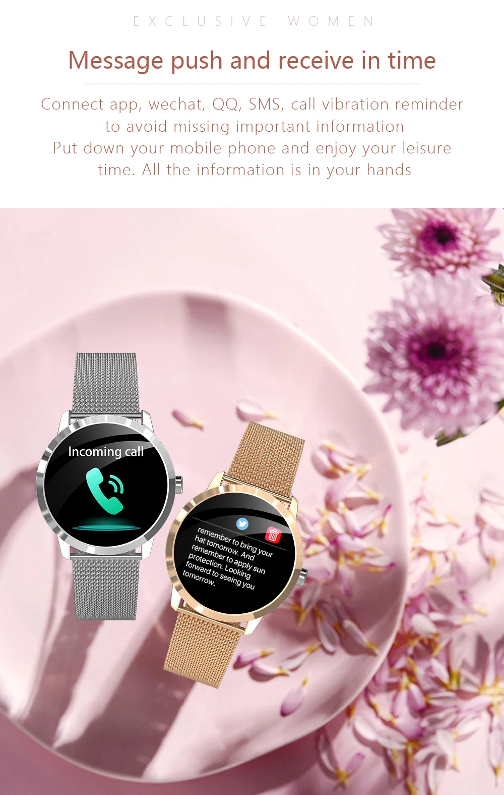 Пользовательские циферблаты 39 мм женские умные часы с сердечным ритмом и кислородом для женщин менструальный период Смарт-часы для женщин Samsung iPhone<;br/> Параметры продукта:<;br/>1. Основной набор микросхем: скандинавский 52832.<;br/>2. Память: 512кб + 64кб подключаемый 64 МБ.<;br/>3.G- Датчик: SC7A20.<;br/>4. Частота сердечных сокращений: LC11.<;br/>5. Экран: 1,09 дюйма IPS разрешение цветного экрана: 240*240.<;br/> 6.клавишный режим: Все сенсорные панели + боковые кнопки.<;br/>7. Тип батареи: полимерный литиевый аккумулятор 180 мАч.<;br/>8. Характеристики зарядного устройства: 1A или ниже.<;br/>9. Тип зарядки: Pogo Pin.<;br/>10. Тип двигателя: SMD мотор 0408.<;br/>11. Срок службы батареи: обычно используется 6 дней; 30 дней в режиме ожидания (на основе on180mAh).<;br/>12.Bluetooth:BLE 5,0.<;br/>13. Тип библиотеки слов: многоязычный по желанию.<;br/>14. Напряжение при зарядке: 5,0 V.<;br/>15. Применимые модели: iOS 8,2 и выше; Android4.4 и выше.<;br/> Основная функция:<;br/>1. Шаги, расстояние, калории, мульти-режим движения.<;br/>2. Пульс, кровяное давление, монитор сна, измерение уровня кислорода в крови, Женский физиологический цикл.<;br/>3. Будильник, напоминание о напитке, напоминание о сидячем положении, напоминание о звонке, напоминание о разрыве и т. д. Уведомления (SMS/QQ/Wechat/Skype/Facebook/Twitter/Line/WhatsApp).<;br/>4. Двойной пользовательский интерфейс, игра, повышение до пробуждения, рынок циферблатов, Поиск телефона, время, Отклонение вызова на смарт-часах, OTA. <; Br/> Языки:<;br/> приложение поддерживает более 20 языков (традиционный китайский, упрощенный китайский, английский, японский, корейский, немецкий, русский, испанский, итальянский, французский, румынский, португальский, арабский, греческий, голландский, польский, турецкий, индонезийский, Таиланд, Вьетнам); Браслет push поддерживает 50 языков; Дисплей UI поддерживает 20 языков.<;br/> спортивные 20 + режимов: ходьба, бег, туризм, Велоспорт, скакалка, йога, аэробика, спиннинг, Каякинг, эллиптический мех, настольный теннис, теннис, гольф, баскетбол, футбол, волейбол, скалолазание, танцы, Катание на роликах, бадминтон