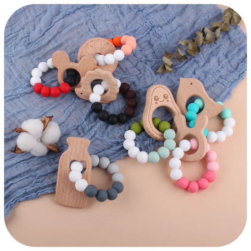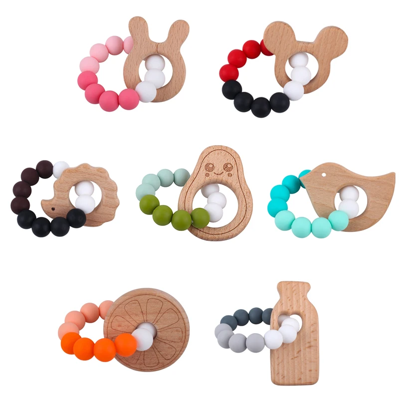 1pc Food Grade Silicone Beads Baby Teether Round Animal Shape Crib Rattle Infant Wooden Oral Care Ring Toys Kids Birth Gift