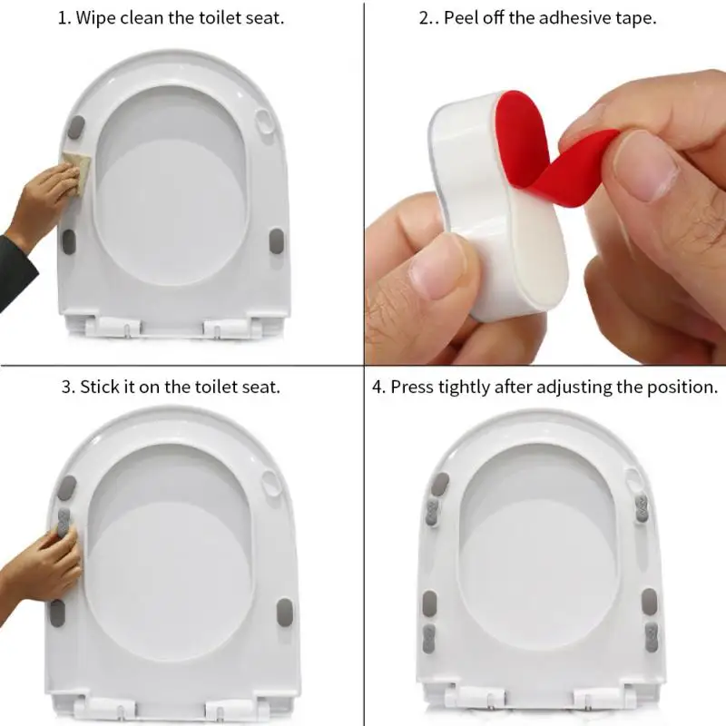Простая установка: чистое кольцо для сиденья унитаза, сохраняет сухость, Оторвите клейкую ленту, прикрепите бампер к кольцу для сиденья унитаза, нажмите, чтобы обеспечить прочное сцепление