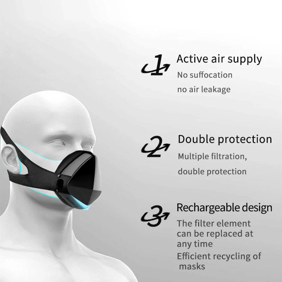 1. Мини-вентилятор в сочетании с двигателем для подачи воздуха может активно производить около 1 литра свежего кислорода для удовлетворения спроса на дыхание во время напряженных упражнений;