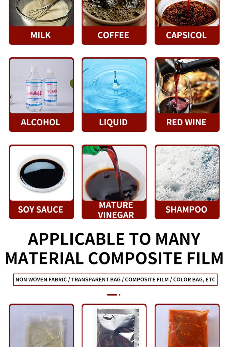 Эта Жидкостная упаковочная машина подходит для упаковки чистой жидкости с хорошей текучестью и без примесей (таких как вода, уксус, соевый соус, пищевое масло и т. д.)