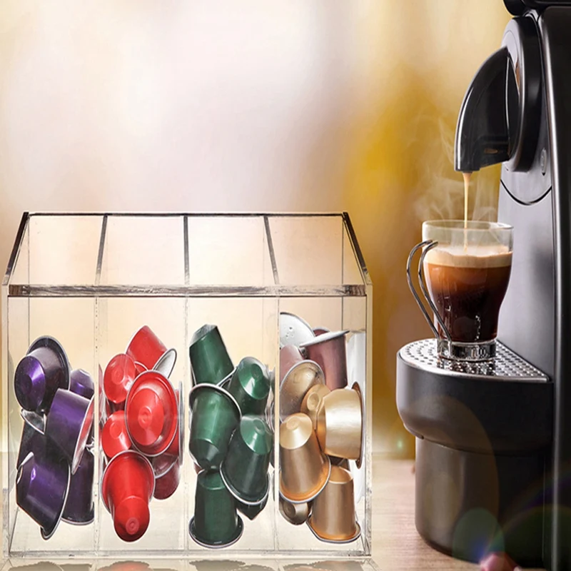 A crystal clear acrylic storage box that's perfect for holding and organizing coffee capsules, tea bags, sugar packets, or jewelry and craft supplies.