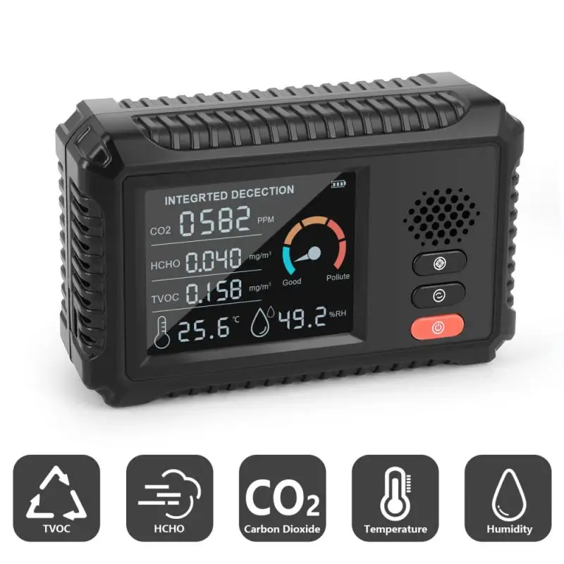 1. Обновите внутренний монитор качества воздуха с помощью встроенного электрохимического датчика Дротика, который может точно обнаруживать двуокись углерода (CO2), формальдегид (HCHO), летучие органические соединения (TVOC), температуру и влажность.