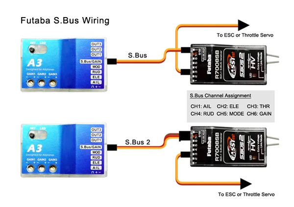 Новый A3 серии обеспечивает 5-канальный входов и 3-канальный блок питания с выходами. Вам нужно только подключить приемник и сервоприводы к соответствующим контактам на стороне контроллера. Ручки используются для регулировки усиления для каждого режима полета, по часовой стрелке для увеличения, против часовой стрелки для уменьшения. Futaba's S.Bus и S.Bus 2 теперь поддерживаются новой серии A3.