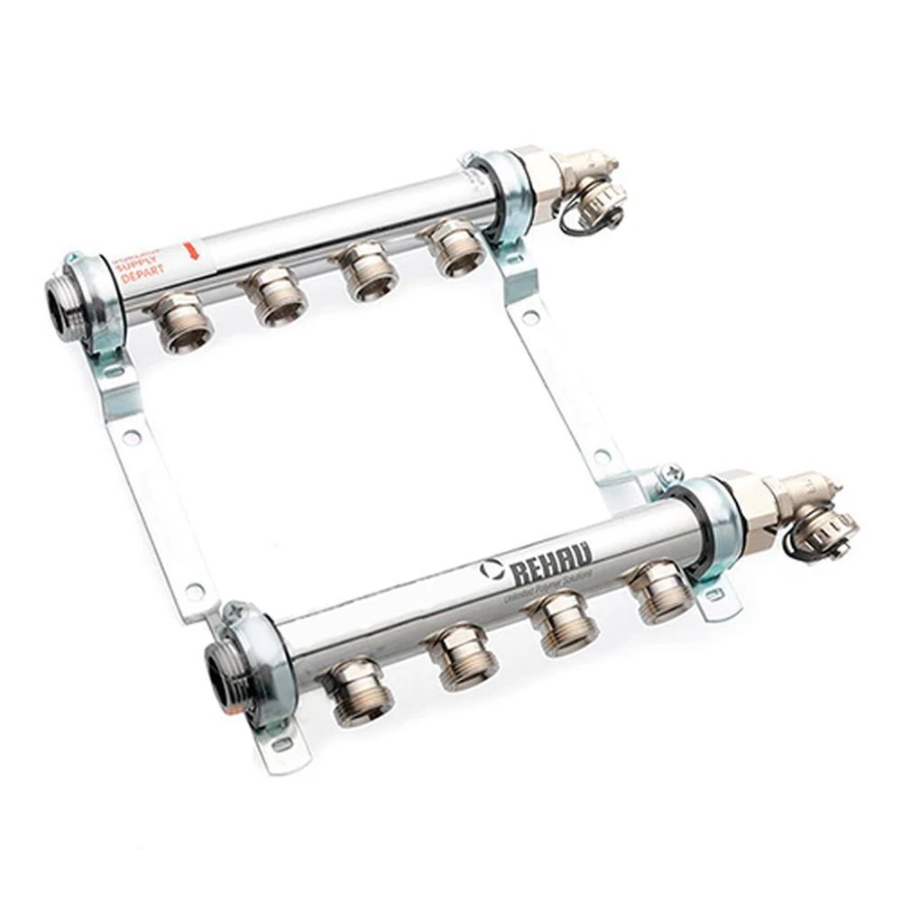 В комплект входят:- подающий и обратный коллекторы, с врозможностью двустороннего присоединения с наружной резьбой G 1" под плоское уплотнение; - 2 никелированные заглушки G 1" со встроеными воздушными клапанами и уплотнением; - ниппельные отводы под резьбозажимные соединения REHAU Евроконус G 3/4"; - коллекторы установлены на звукоизолированные оцинкованные кронштейны.