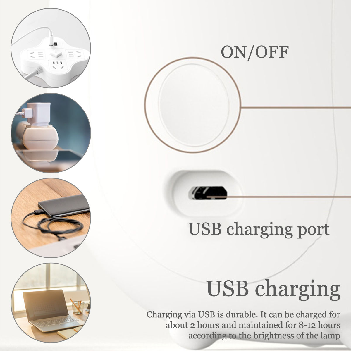 【USB Rechargeable】Встроенный аккумулятор 900 мАч, питание от USB кабеля. Заряжайте около 2 часов и держите в течение 8-12 часов в зависимости от яркости лампы. Пожалуйста, полностью зарядите перед первым использованием.