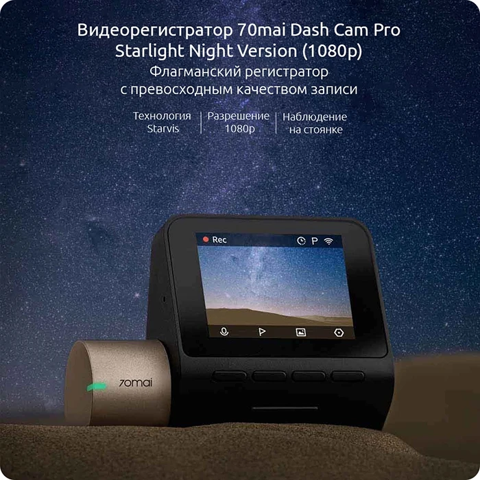 70mai Dash Cam Pro Starlight Night Version – отличный видеорегистратор по доступной цене. Благодаря умному сенсору Sony IMX307 из серии Stravis можно навсегда забыть о «слепом» времени суток – каждая деталь будет отчетливо видна как ночью, так и поздним вечером, что так важно в нашей стране. Угол обзора 130˚ и запись в разрешении 1920х1080 пикселей позволит зафиксировать правонарушения или удивительные моменты в дороге в высочайшем качестве для максимальной пользы. Компактные габариты устройства не займут много места в салоне автомобиля, а стильный дизайн в металлическом корпусе угодит даже самым искушенным автолюбителям.