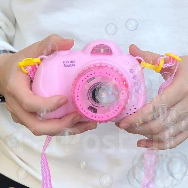В наборе: фотоаппарат, жидкость с мыльными пузырями, верёвочка для подвешивания игрушки на шею.