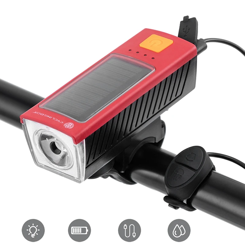 Велосипедная коробка Солнечный велосипедный светодиодный светильник зарядка через USB 400 люмен 1200 мАч 120дБ роговой светильник T6 велосипедный передний светильник для велосипеда