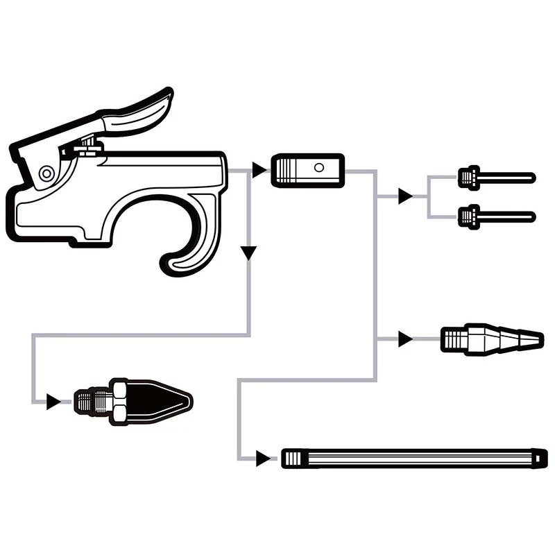 Включает в себя: пистолет, патрон, адаптер безопасности, игла для надувания, наконечники, муфты/вилки M/F