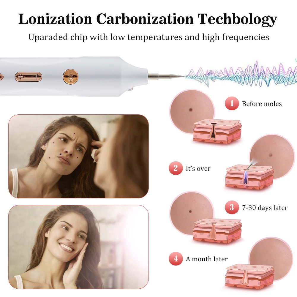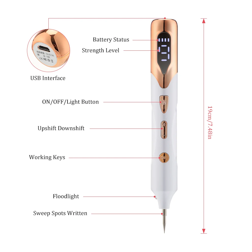 1.Используя технологию карбонизации ионизации, микрокомпьютерный контроль, физическое Удаление родинок, безопасно и быстро разбавляет меланин, восстанавливает безупречную кожу,