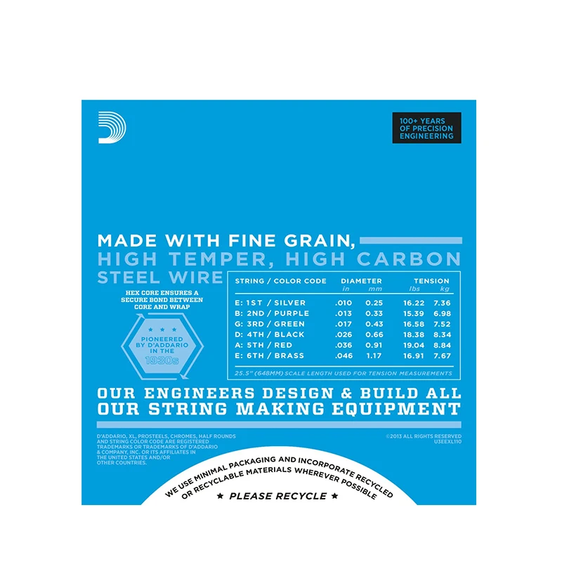 EXL110, самый продаваемый набор, предлагает идеальное сочетание тона, гибкости и долгой жизни. Стандарт для большинства электрогитар s.XL с никелевой обмоткой, самые популярные электрогитарные гитарные струны D'Addario's, имеют прецизионную рану с никелированной сталью на тщательно нарисованной, шестигранной форме, сердечник из высокоуглеродистой стали. Результат, струны с длительным, характерным ярким тоном и отличной интонацией, идеально подходят для широкого спектра гитар и музыкальных стилей.