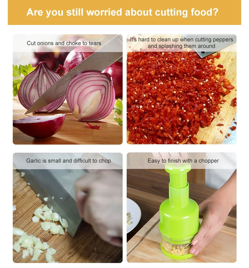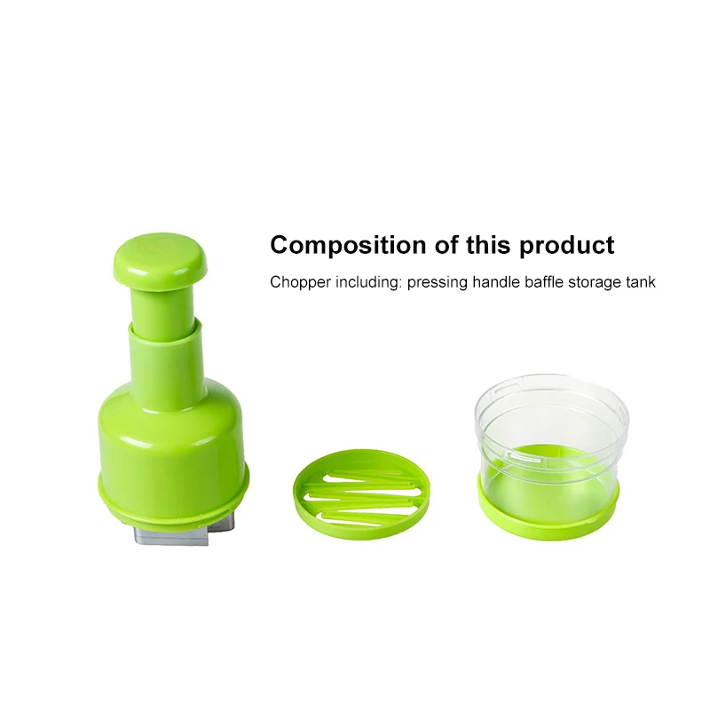 Характеристики: Изготовлен из ПП PS материала, лезвия из нержавеющей стали, трудосберегающая резка, Ручной пресс, прикрепляется форма руки, легко моется, может резать лук, чеснок, перец и т. Д.