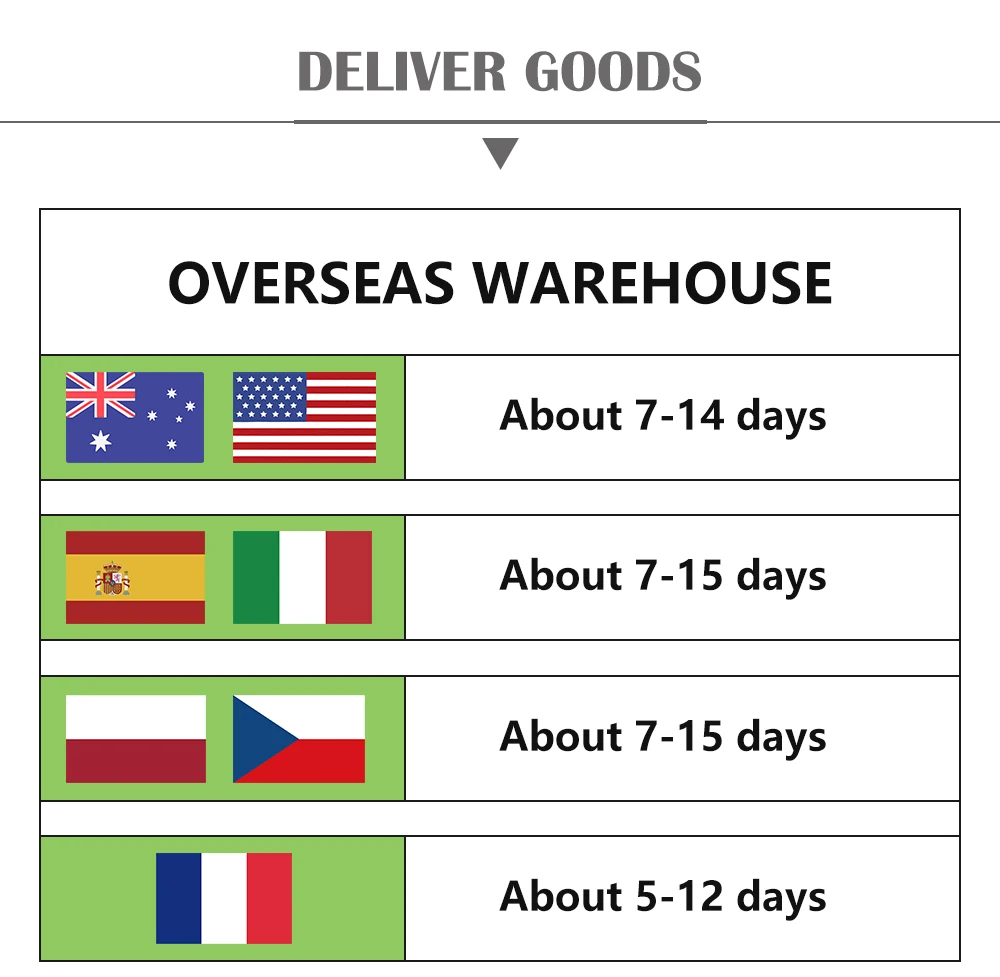 3. Доставка от нас/FR/ES/AU/PL/CZ/IT/UK/DE warehouse, срок доставки составляет около 5-18 дней после того, как мы отправим.