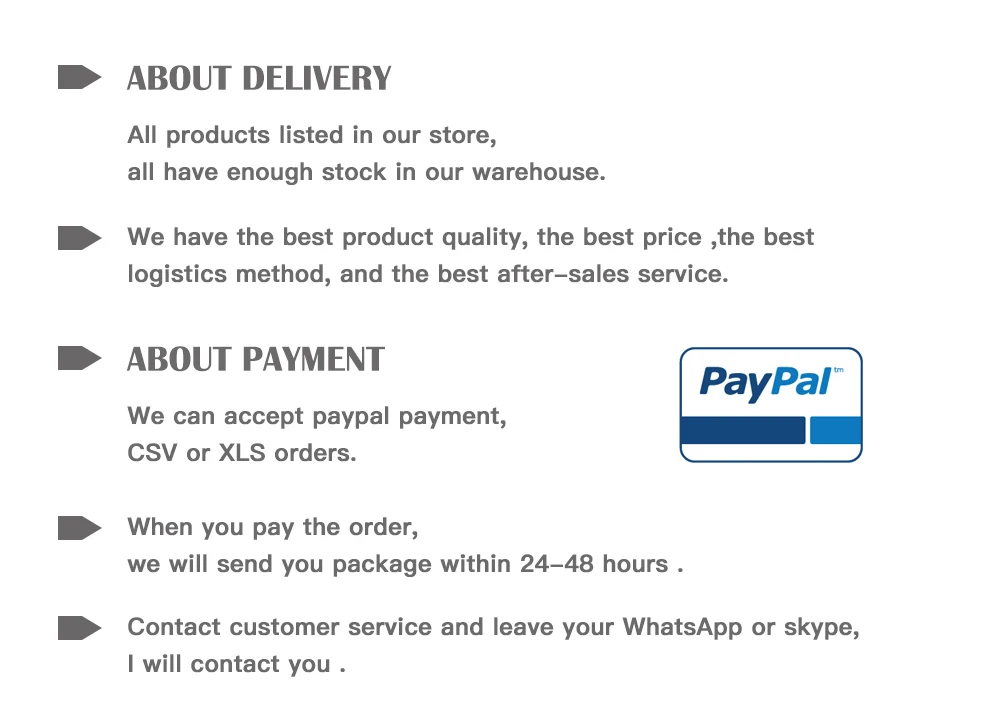 1. Мы поддерживаем дропшиппинг, любые коммерческие документы не включены в посылка, пожалуйста, закажите его, и мы организуем доставку в течение 0-72 часов. Информация о доставке может быть отслежена.
