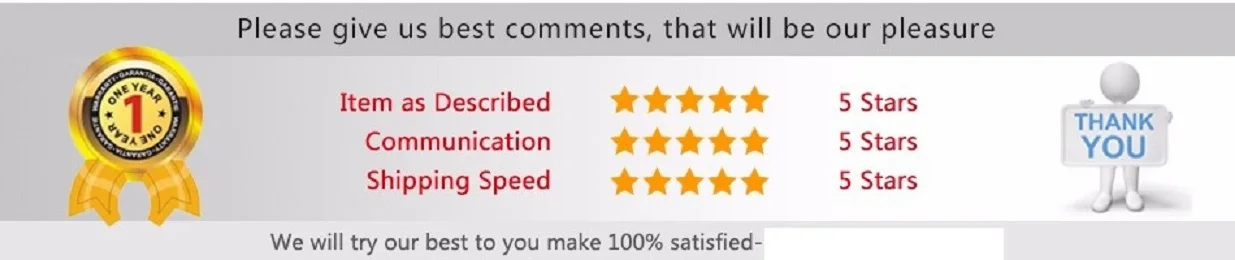 Если вы удовлетворены нашей продукцией и обслуживанием, пожалуйста, оставьте нам 5 звезд положительные отзывы. Если вы не удовлетворены нашими продуктами и обслуживанием, пожалуйста, свяжитесь с нами, мы постараемся сделать все возможное, чтобы решить проблемы