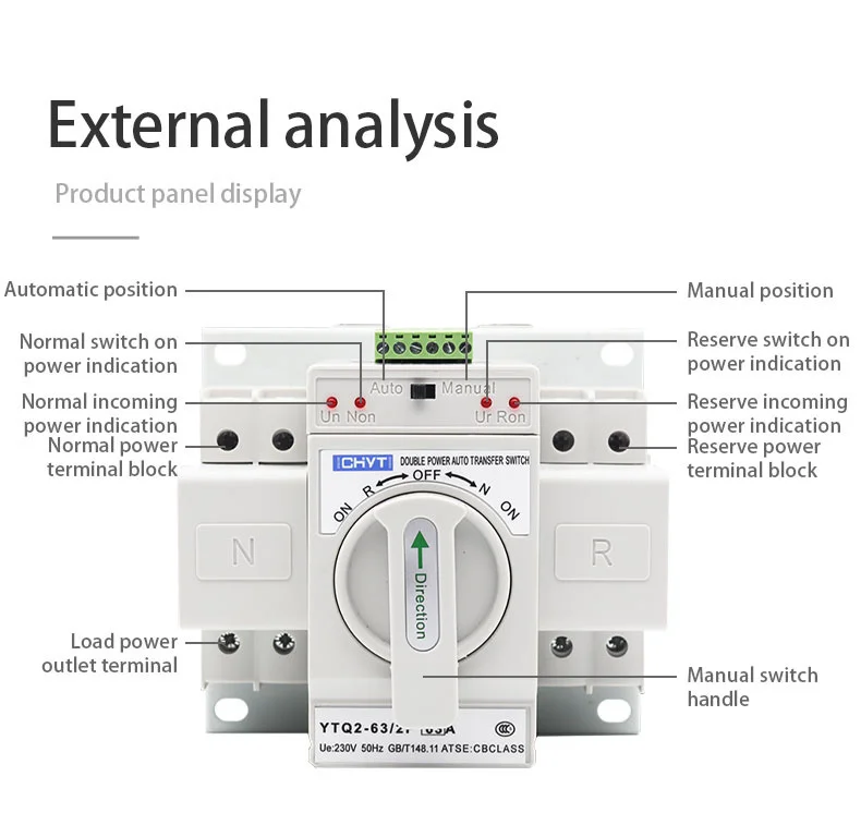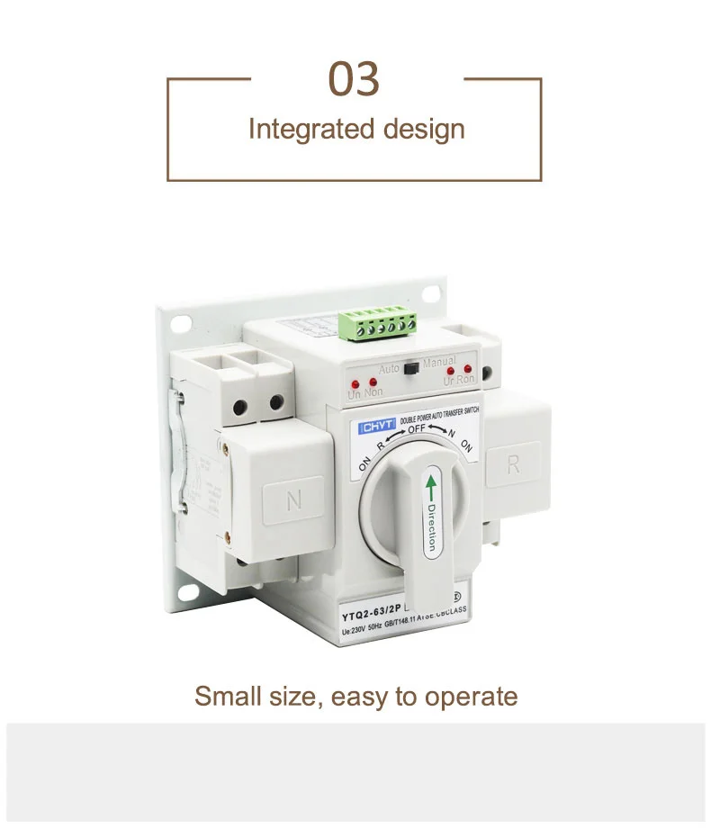 YTQ2-63 Micro-Breaking Dual Power Transfer Switch (hereinafter referred to as transfer switch) is suitable for AC 50/60Hz dual power supply system with rated operating voltage of 230V/400V and rated operating current form 63A. Optional transfer of dual power can be made according to requirement,. The product owns short circuit function, as well as fire protection, double-break and output ON signal function.