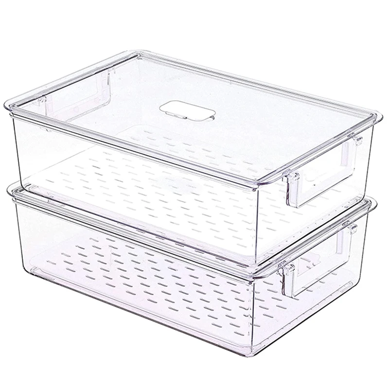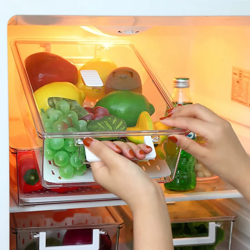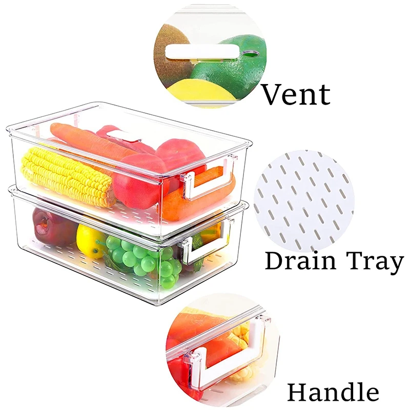 [Прозрачный органайзер для холодильника:] сохраняет еду свежей! Прозрачные пластиковые стены позволяют легко видеть содержимое и видеть, когда корзина должна быть очищена. Ударопрочный, прочный дизайн длится через разливы, падения и капли в течение многих лет использования качества! Небезопасная посудомоечная машина!