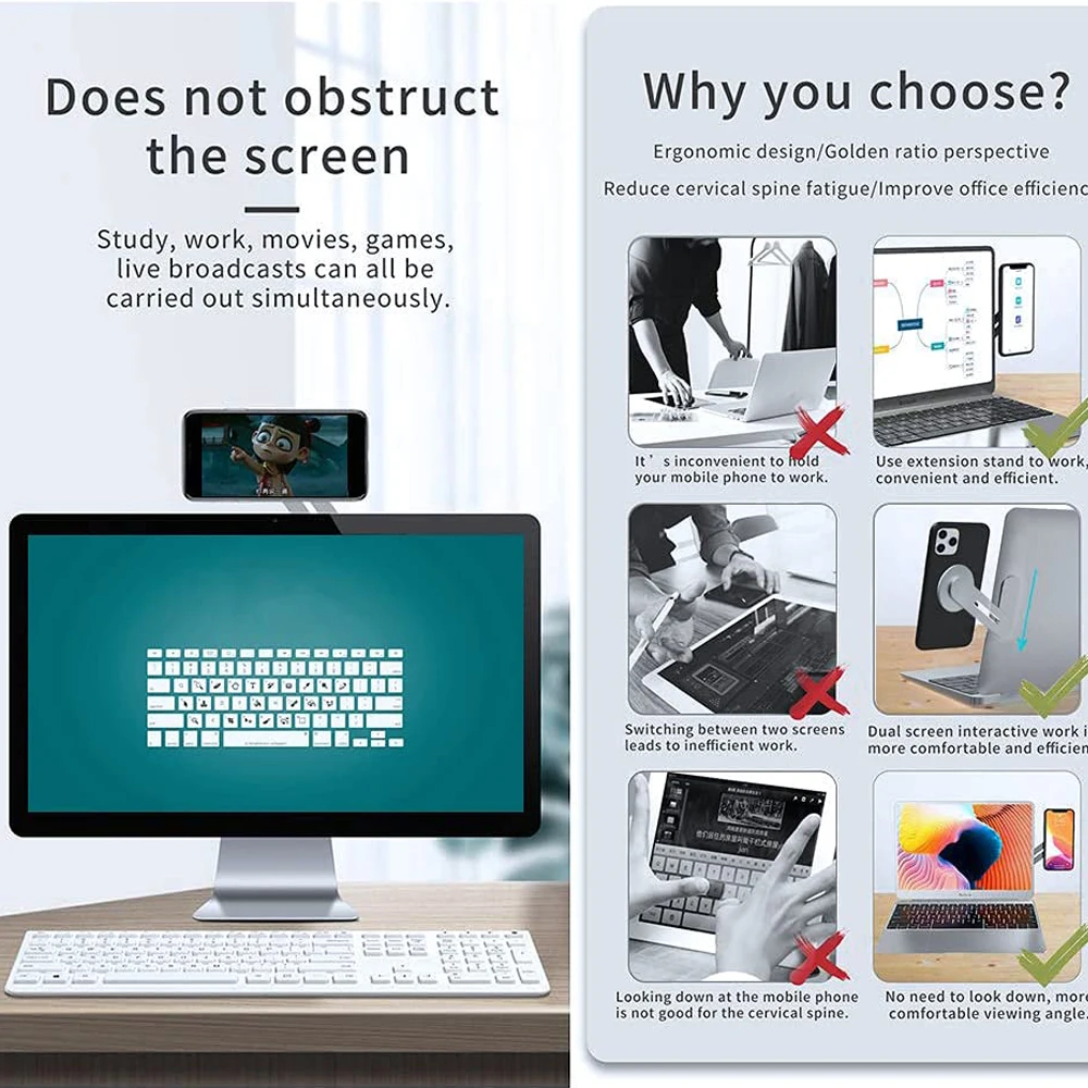 【Высокая магнетизм и стабилизация 】 держатель телефона для монитора компьютера использует магнитный дизайн, который может прочно адсорбировать мобильный телефон рядом с ноутбуком или дисплеем. Он очень прост в установке, переноске и использовании. Легко выполнять несколько задач между телефоном и ноутбуком, не снимая телефон.