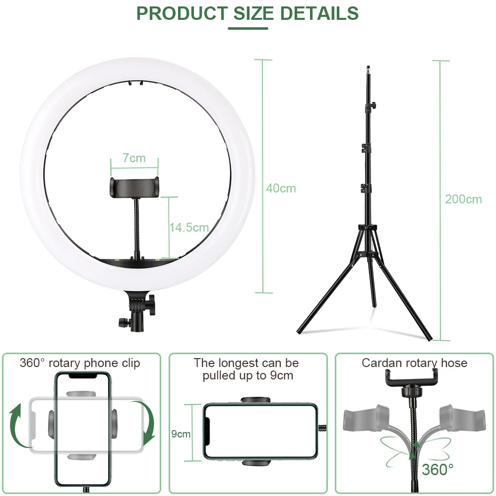 Этот кольцевой светильник включает вращающийся на 360 ° держатель телефона для портретного режима или ландшафтного режима. Совместим с сотовыми телефонами и большими устройствами, такими как DSLR или камеры до 6 фунтов.