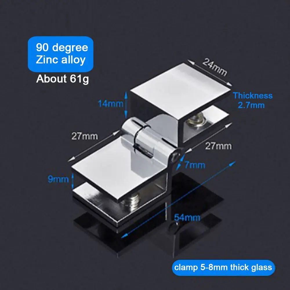 100%Brand New and High Quality Item Name: Door Hinges Color: Silver Material:Zinc alloy Weight:About 50g;65g;75g Description: 1.90 degree glass-to-glass clip for securing two fixed panels that create a 90° corner. 2.Durable and practical. 3.Easy to install,very convenient to use. 4.Made of stainless steel,won't rust. 5.Suitable for glass, wood, metal plates etc. Package Includes: 1pc*Glass Hinges Note: 1. Due to the light and screen difference, the item's color may be slightly different from the pictures. 2. Please allow 1-2 cm differences due to manual measurement.