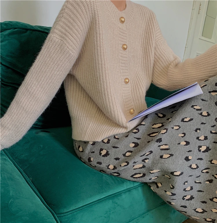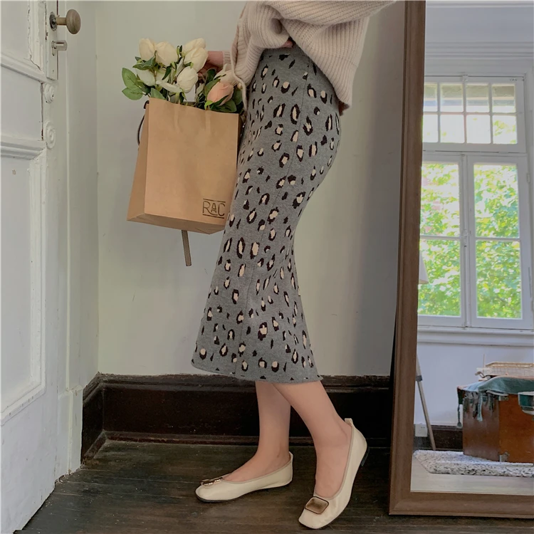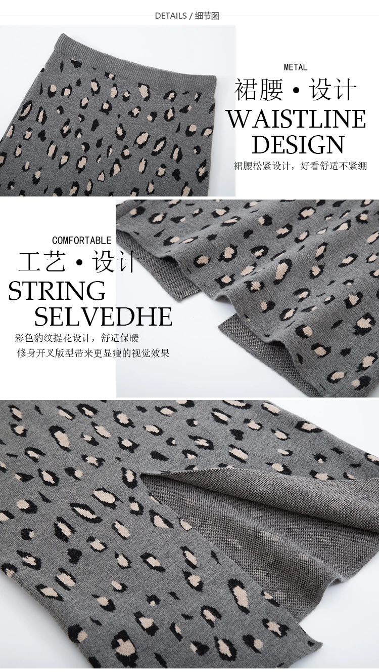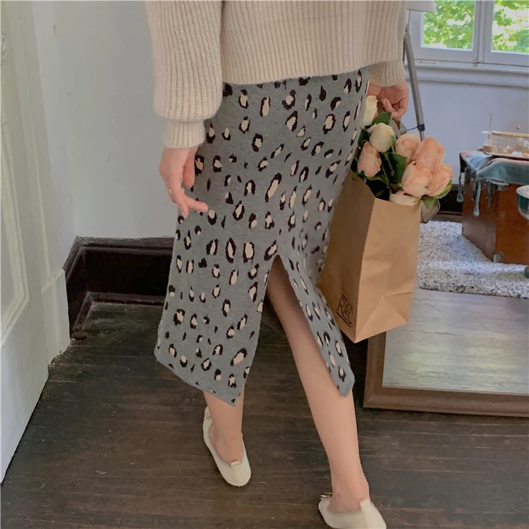 TingYiLi хаки серый розовый Леопардовый свитер юбка осень зима Высокая талия вязаная миди юбка корейский разрез женские юбки футляр