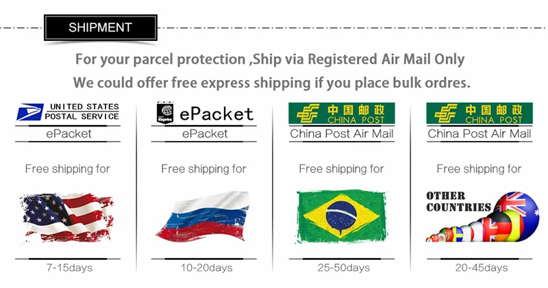 1. Доставка по всему миру.(За исключением некоторых стран и APO/FPO) 2. Заказы обрабатываются своевременно после подтверждения оплаты. 3. Мы отправляем только по подтвержденным адресам заказа. Ваш адрес заказа должен совпадать с вашим адресом доставки. 4. Представленные изображения не являются фактическим товаром и предназначены только для справки. 5. Время доставки определяется перевозчиком и не включает выходные и праздничные дни. Сроки доставки могут меняться, особенно во время курортного сезона. 6. Если вы не получили посылку в течение 30 дней с момента оплаты, пожалуйста, свяжитесь с нами. Мы отследим отправку и свяжемся с вами как можно скорее. Наша цель – удовлетворение клиентов! 7. Из-за наличия на складе и разницы во времени, мы выберем доставку Вашего товара с нашего первого доступного склада для быстрой доставки.
