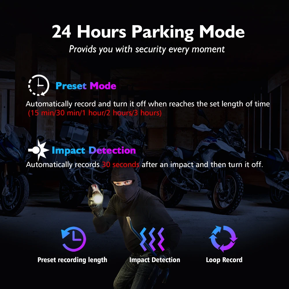 Когда вы подключаете смарт-кабель питания к батарее велосипеда, видеорегистратор автоматически переключается на режим парковки, пока ваш велосипед припаркован и двигатель выключен, функционирует как система видеонаблюдения и автоматически записывает видео на заданную длину записи (автоматический режим), или при обнаружении каких-либо ударов или физического движения (обнаружение удара).