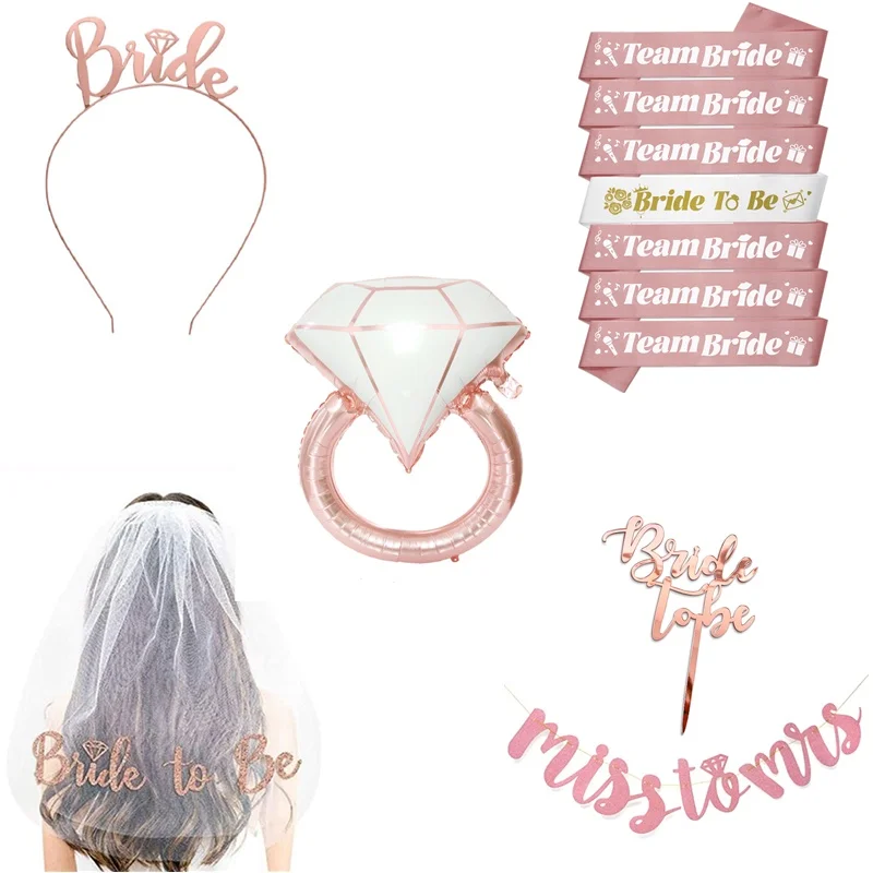 Комплект 02/03/04: петля для волос x 1; Вуаль x 1; Шар из фольги с бриллиантовым кольцом x 1; Пояс для невесты x 1; Надпись "groom to be" sash x 1