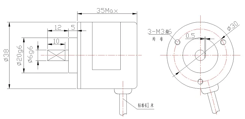 Точность одиночного поворота: 1024P; Абсолютное значение 12 позиций Рабочее напряжение: 5 в пост. Тока; Максимальная Механическая скорость: 3000 оборотов в минуту; Внешний диаметр кодировщика: 3838мм; Размер вала: φ6 × 15 мм; Фиксированная Остановка: φ20 мм, long5мм;Крепежное отверстие: M3Screw,3 монтажных отверстия at30circular; Боковая исходящая линия.