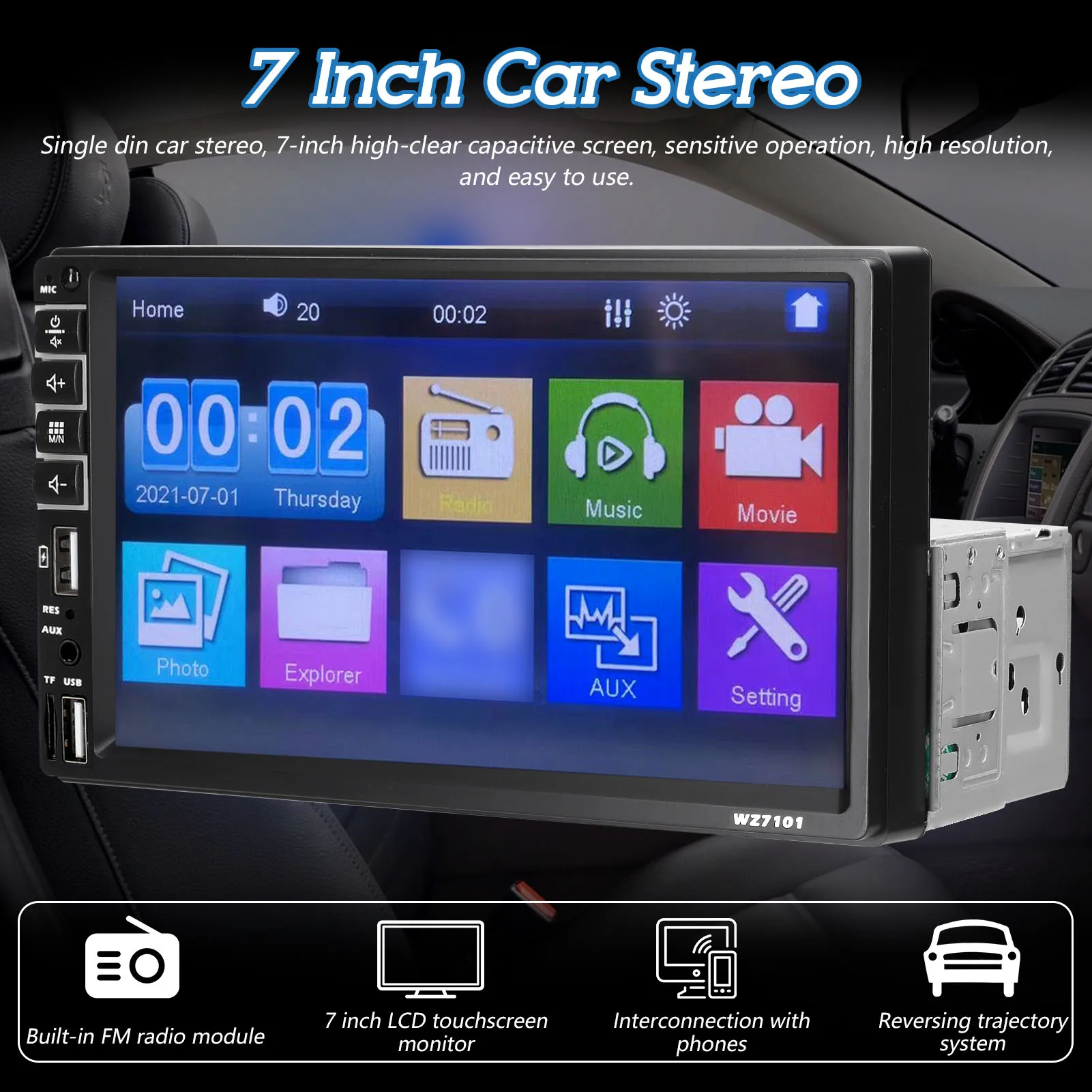 Один din автомобильный стерео, 7-дюймовый прозрачный емкостный сенсорный экран, чувствительная работа, высокое разрешение и простых в использовании.