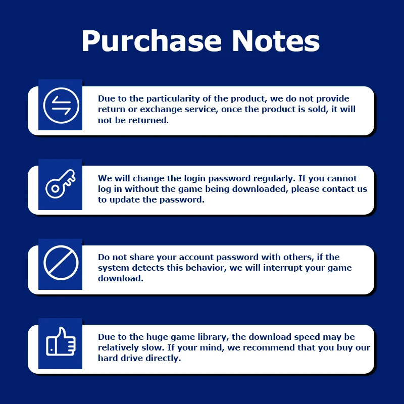 Загрузка игр обычно занимает много времени. Если у вас нет собственного жесткого диска, мы предлагаем вам выбрать наш жесткий диск. Свяжитесь с нами после покупки, и мы предоставим Бесплатные ресурсы для загрузки.