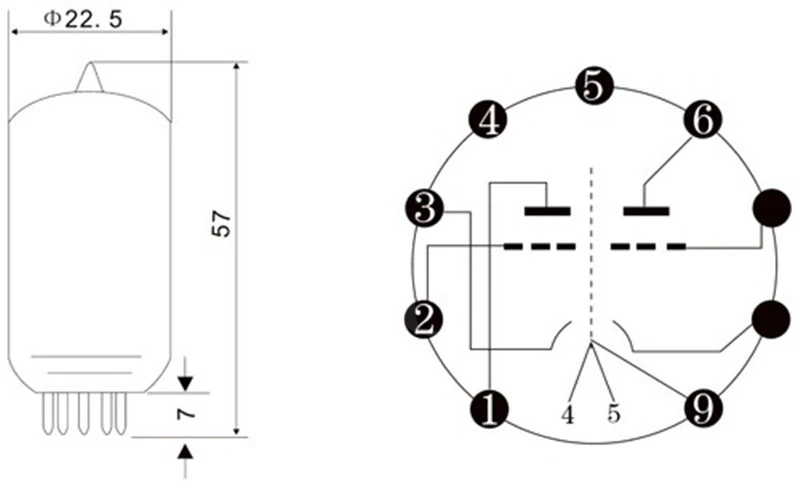 Характеристики: это 9-контактная позолоченная электронная трубка, оксидный катод, непрямой нагрев и двойной Триод с низким уровнем шума.