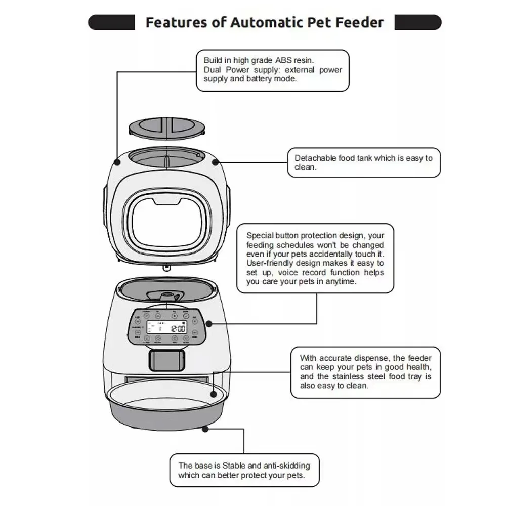 Автоматическая кормушка для домашних животных изготовлена из импортированных экологически безопасных материалов ABS, нетоксичных и пищевых.