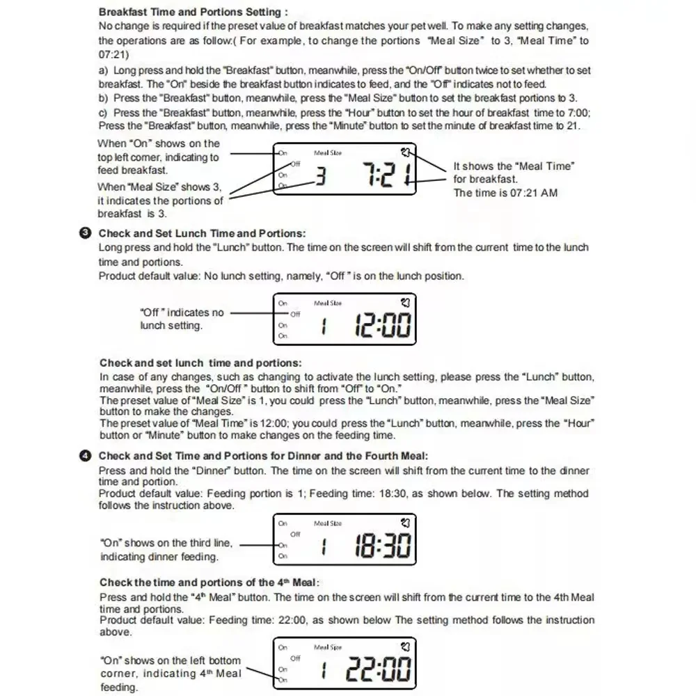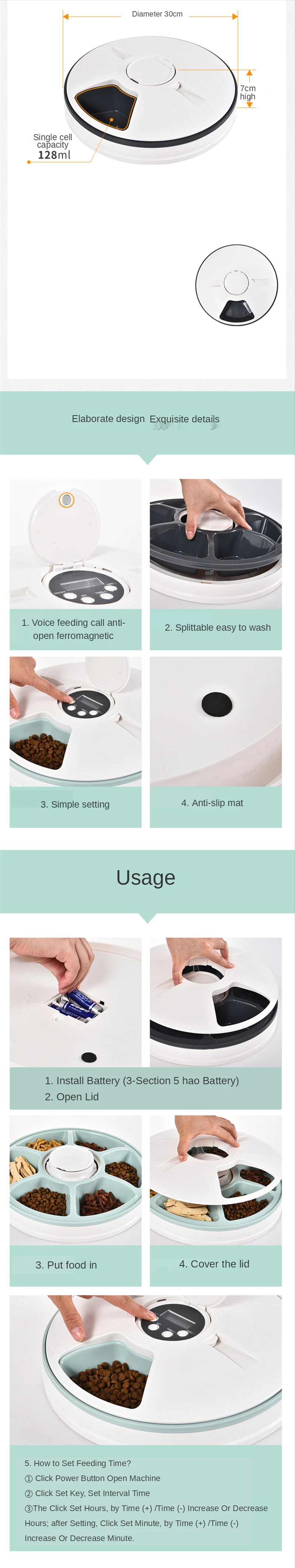 Размер еды составляет около 5g. Вы можете установить размер еды на 1-20 порций в соответствии с вашим питомцем. Этот питатель подходит для маленьких и средних домашних животных. Например, пудель, померань, пастух, биконс фризов, кошек и т. Д.