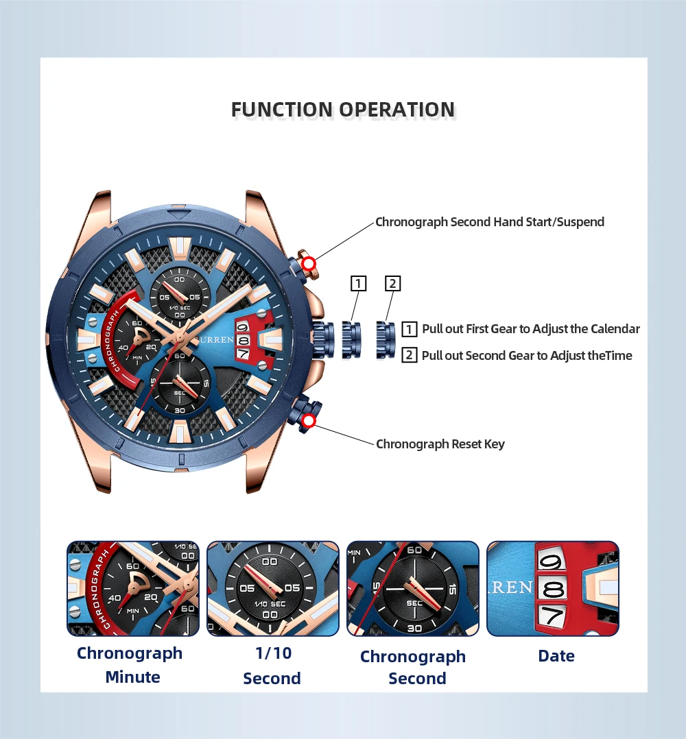 3. Кнопка в 2 часах (над короной), нажмите один раз, полуциферблат хронографа начинает работать, нажмите его снова, полуциферблат хронографа