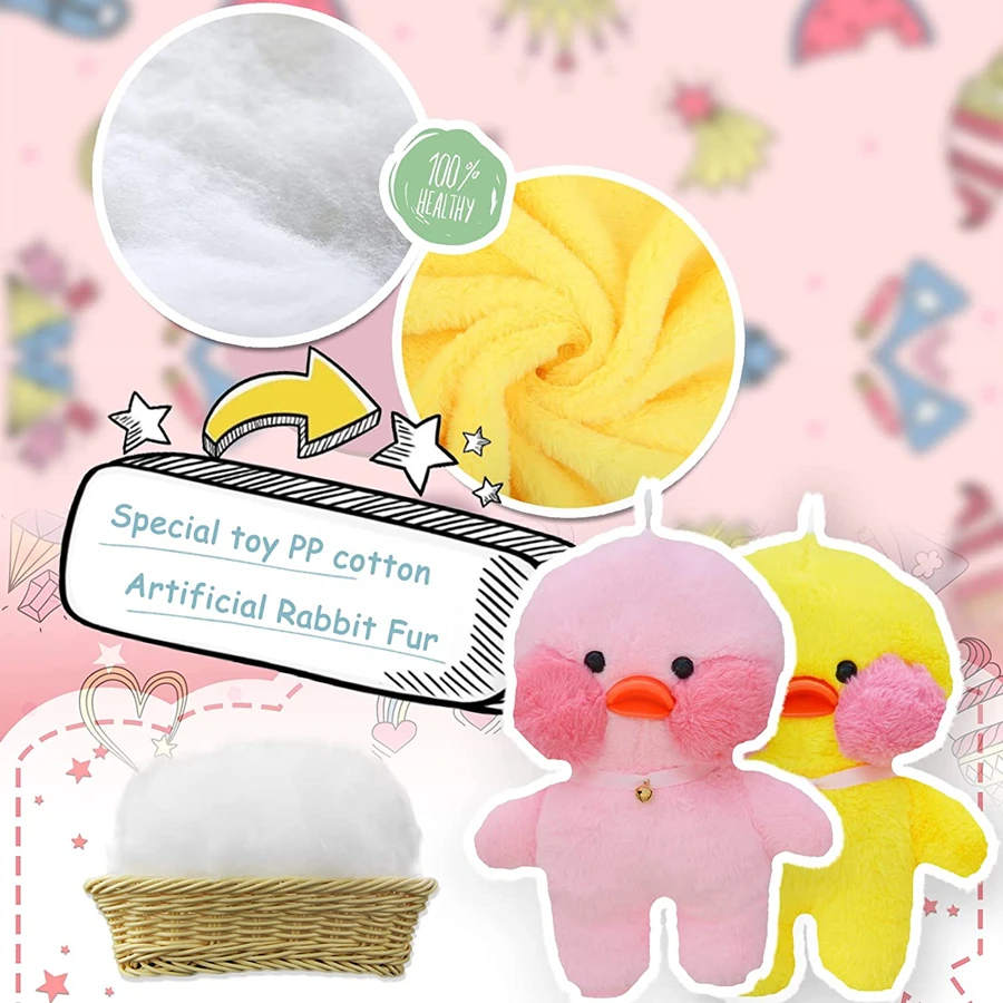 Safe Material The plush stuffed duck is securely sewn from the highest quality polyester and acrylic fabrics and filled with polypropylene plush filling exclusively all new material soft and cuddly could be wash This plush doll has passed the children's toy safety certification It will not cause harm to you and your family