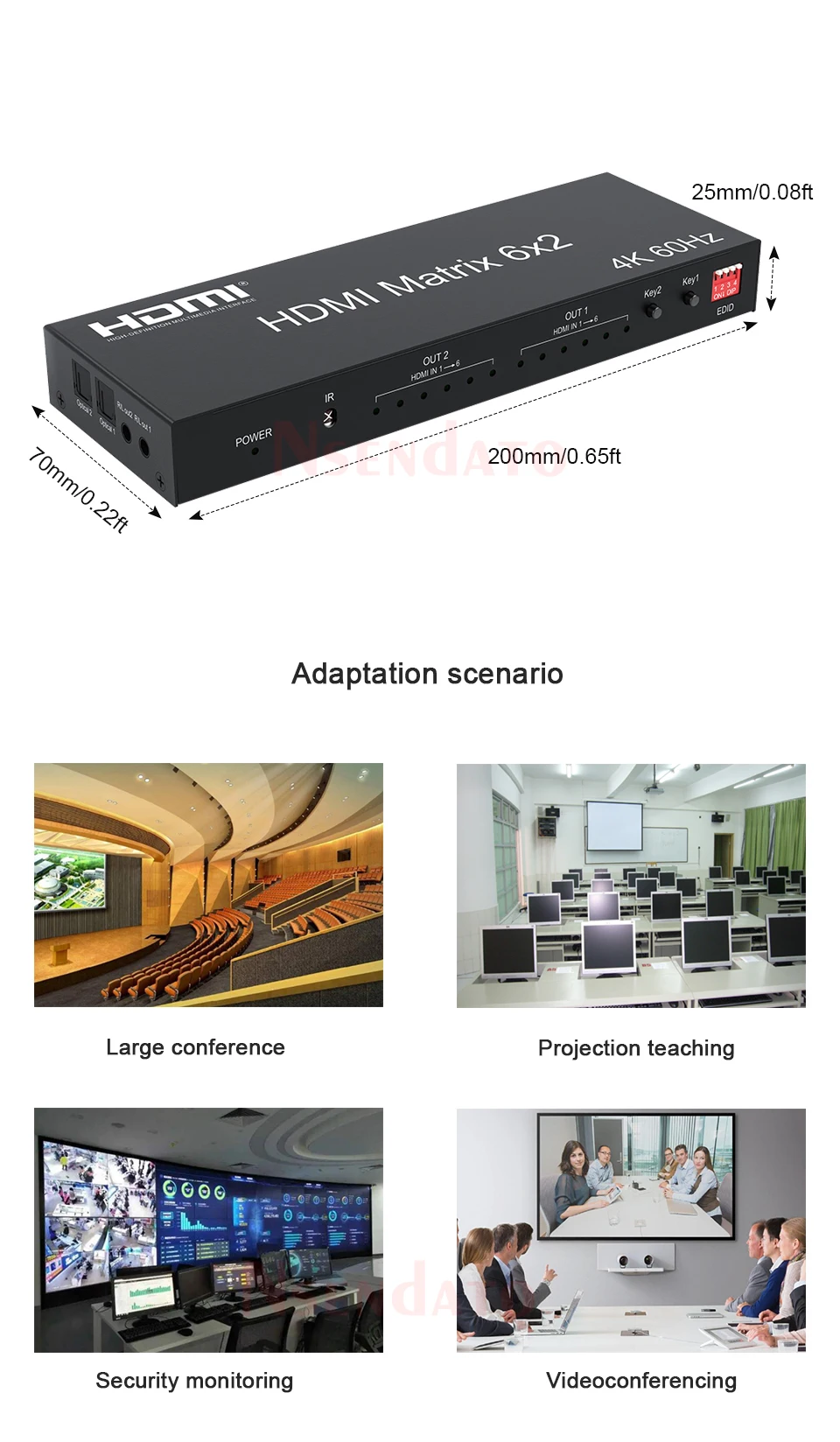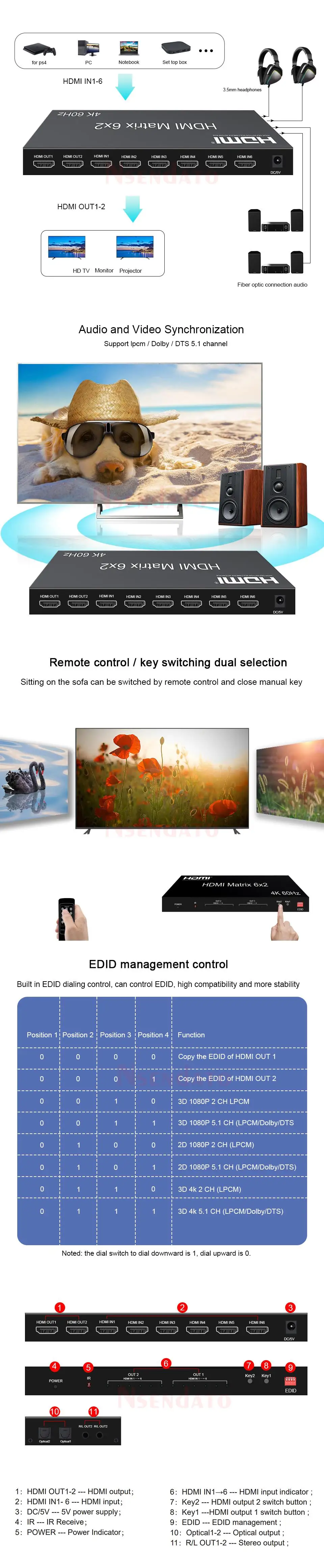 Клеммы с оптическим волокном или стерео выходом для наушников. Матрица Nsendato позволяет легко переключать или делить шесть устройств HDMI на два совместимых монитора или проекторы HDMI. И любые выходные порты могут осуществлять независимый аудиовыход с помощью оптического волокна или стереофонического телефона. Наши устройства предлагают решения для шума, пространства и безопасности, управления центром обработки данных, распространения информации, презентаций конференц-зала, школы и корпоративных условий обучения.