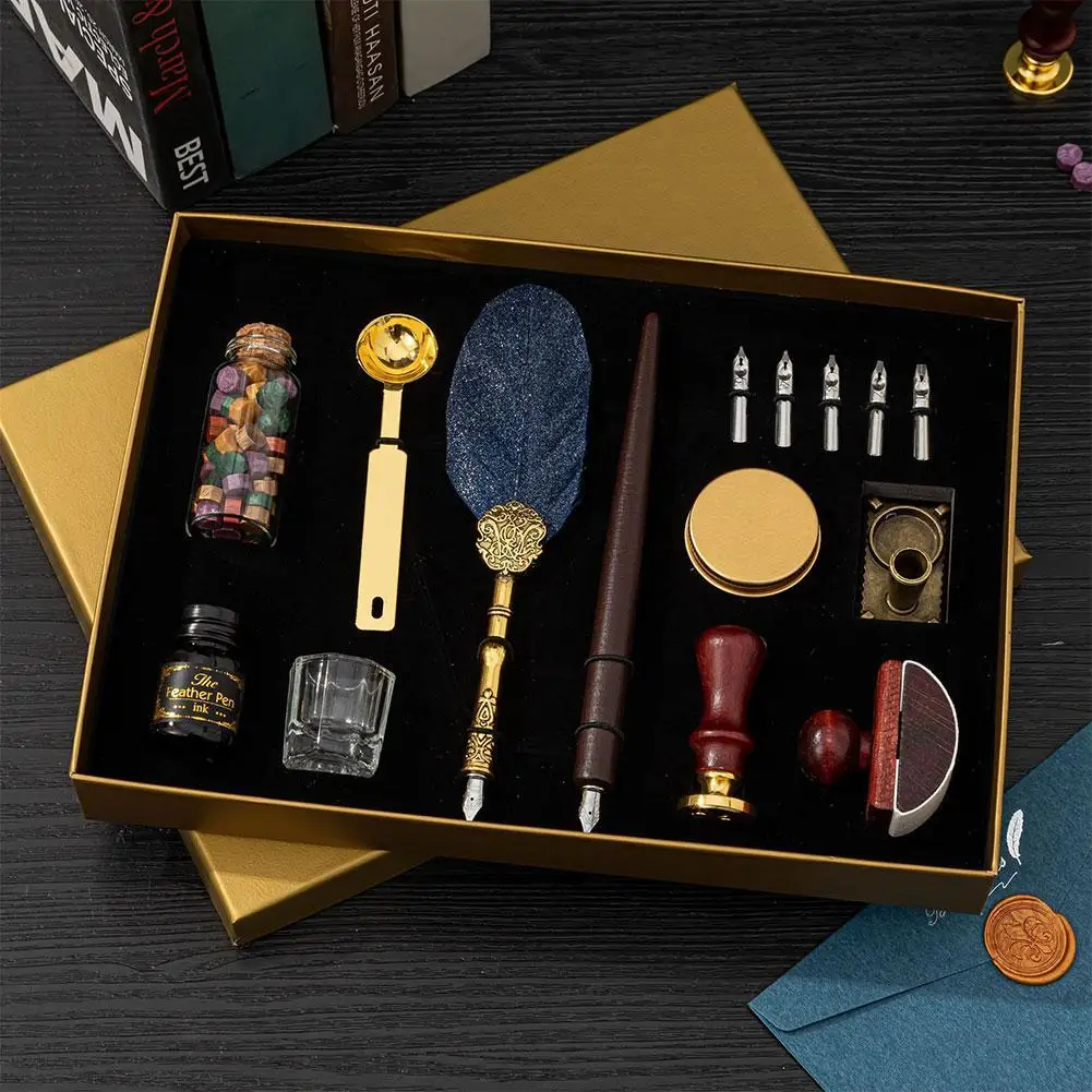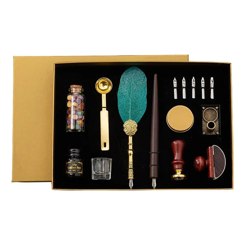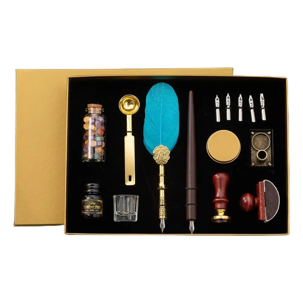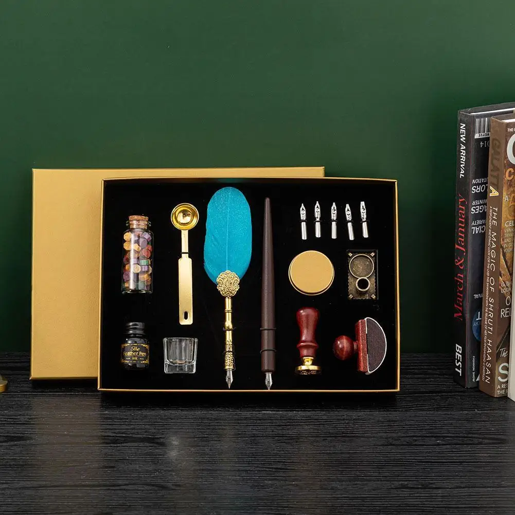 В комплект входит: перо * 1, деревянная ручка * 1, лаковая ложка * 1, Свеча * 1, восковые гранулы * 1 бутылка, сменный наконечник * 5, держатель для ручек * 1, хрустальный держатель ручки * 1, лак, штамп * 1, чернильный блок * 1, чернила * 1 бутылка