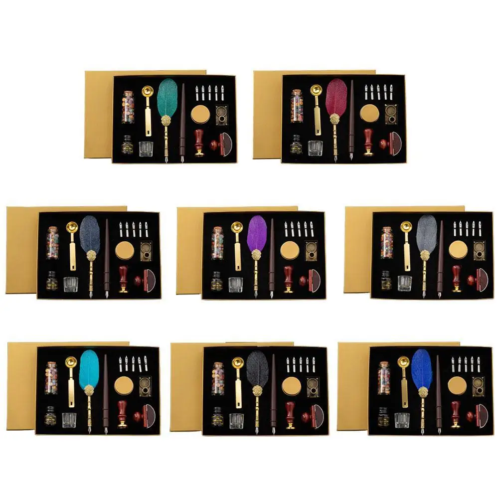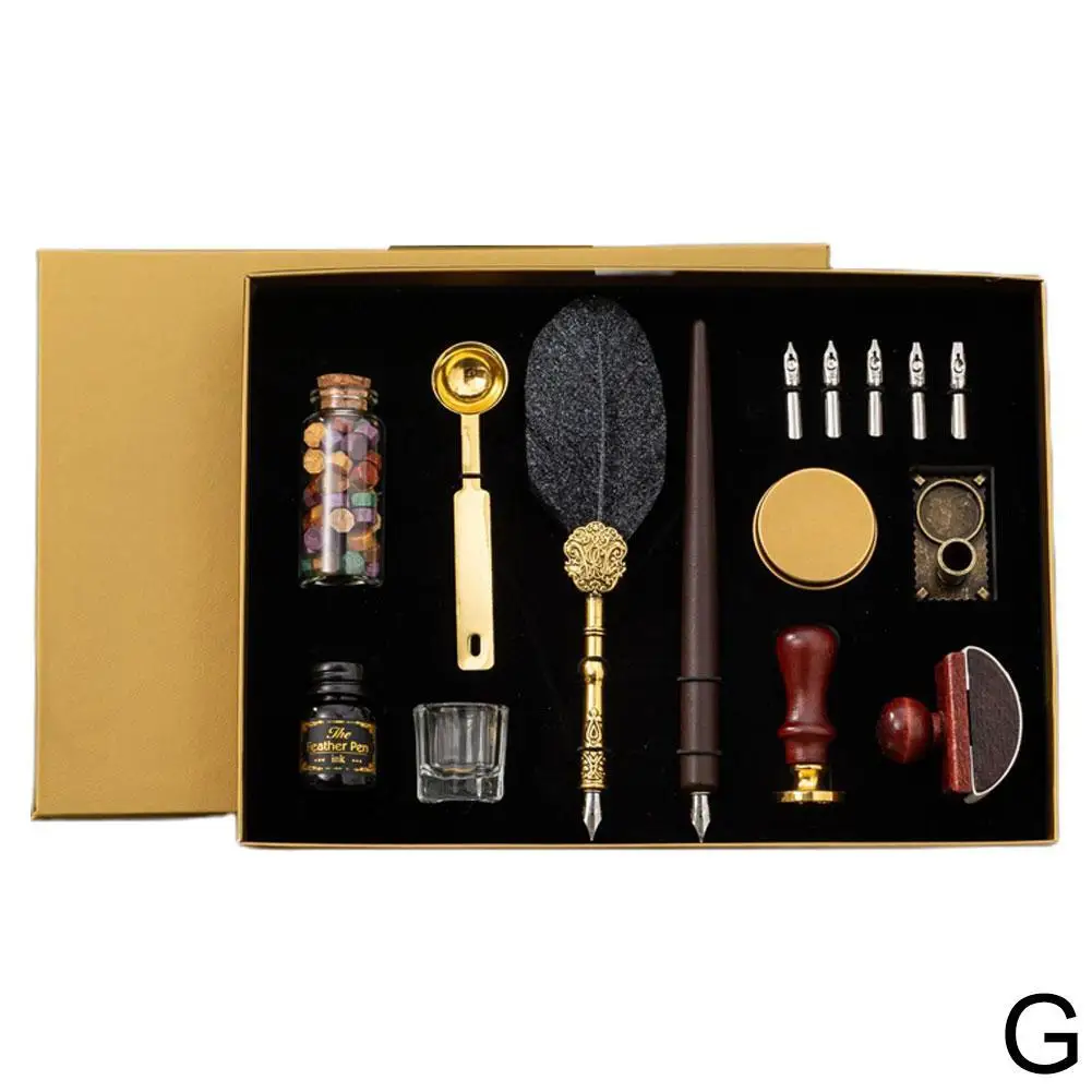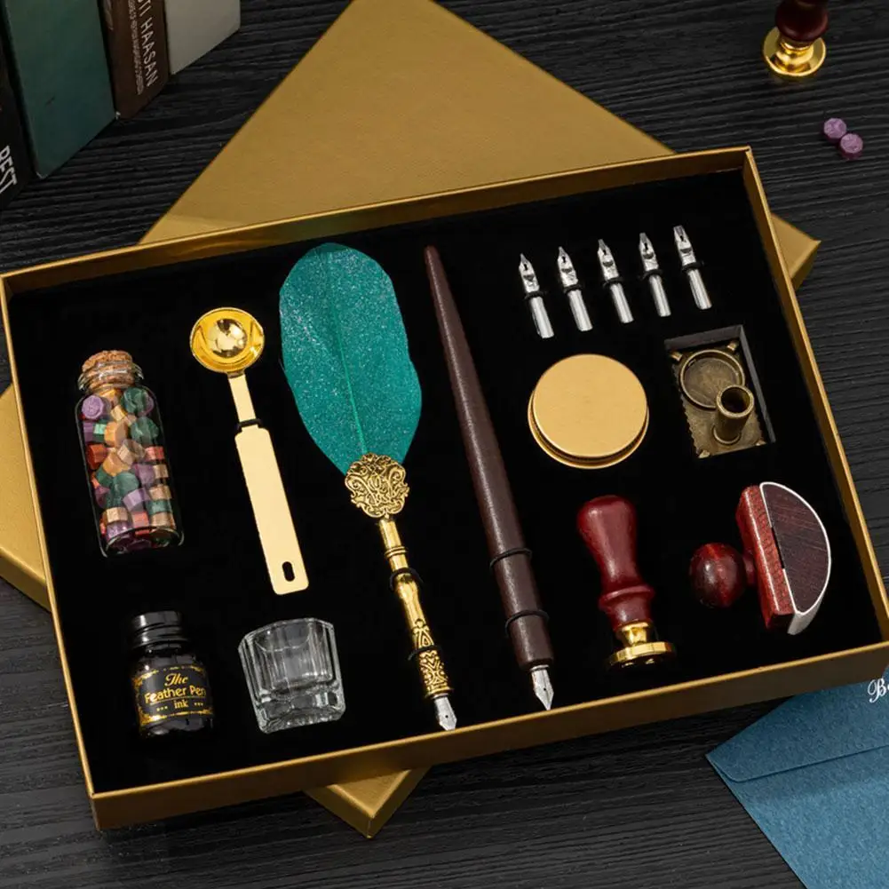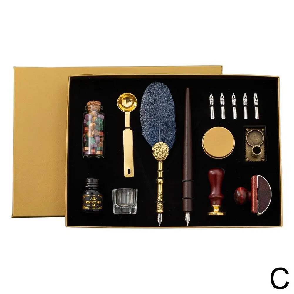 В комплект входит: перо * 1, деревянная ручка * 1, лаковая ложка * 1, Свеча * 1, восковые гранулы * 1 бутылка, сменный наконечник * 5, держатель для ручек * 1, хрустальный держатель ручки * 1, лак, штамп * 1, чернильный блок * 1, чернила * 1 бутылка