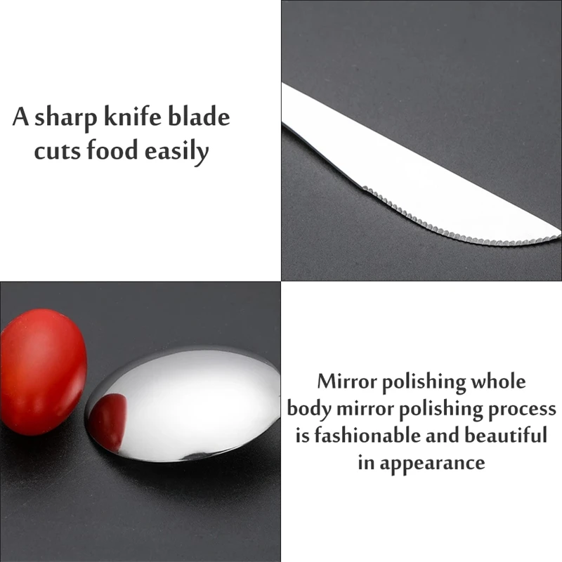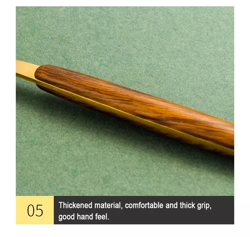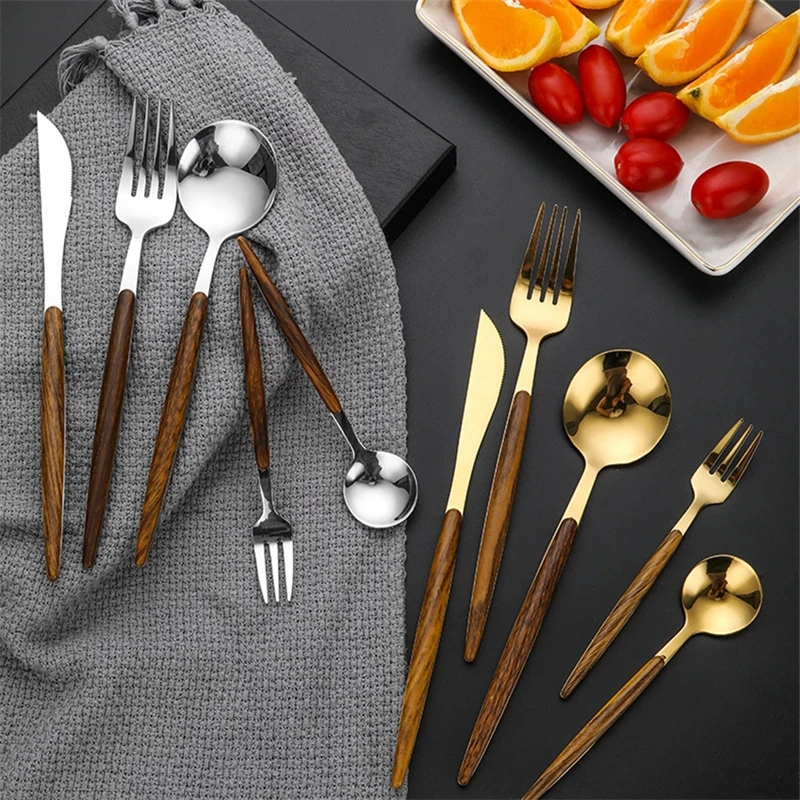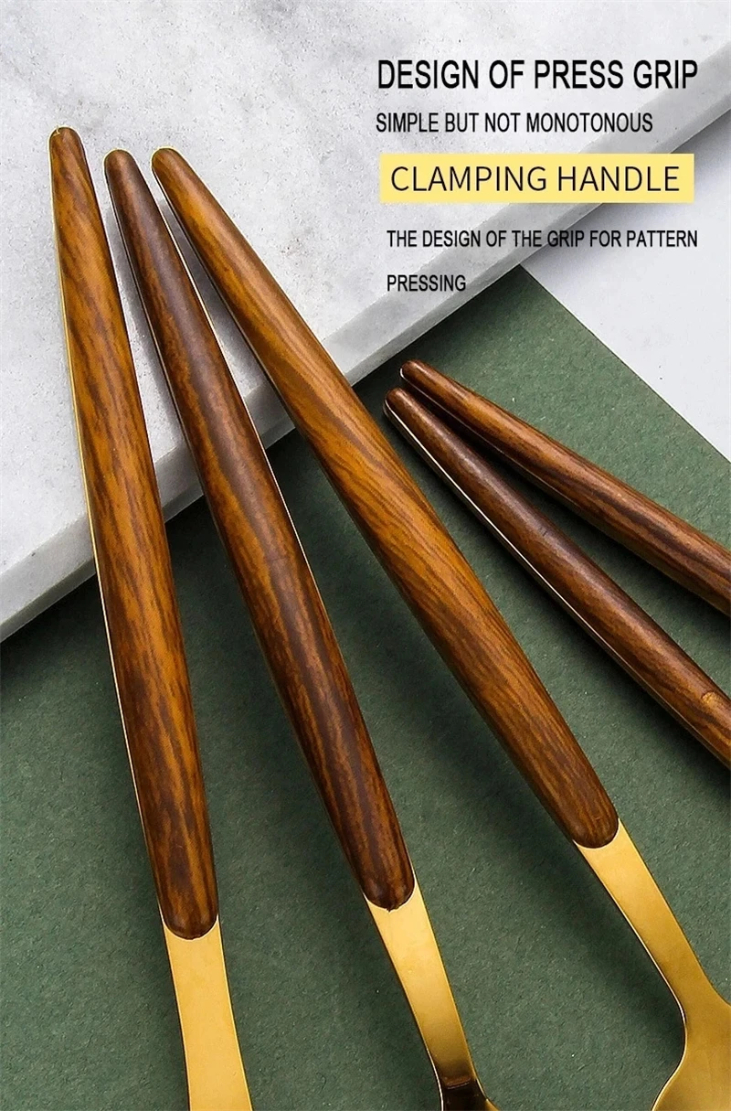 Материал: нержавеющая сталь с деревянной ручкой Цвет: серебристый/золотистый Размеры: Ножи 22 см * 1,5 см Вилка 21 см * 2,6 см Ложка 20,2 см * 4,7 см Десертная Вилка 14,5 см * 1,8 см Десертная ложка 14,5 см * 3,2 см Посылка: 5 шт.: 1 * нож/1 * вилка/1 * ложка/1 * Десертная Вилка/1 * десертная ложка 4 шт.: 1 * нож/1 * вилка/1 * ложка/1 * десертная ложкаПожалуйста, обратите внимание