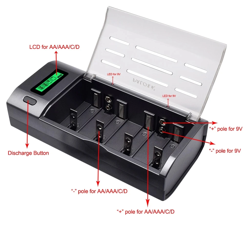 3. ЖК-экран и светодиодный светильник показывают процесс зарядки, ЖК-дисплей для батареи AA AAA C D, светодиодный аккумулятор 9 В.