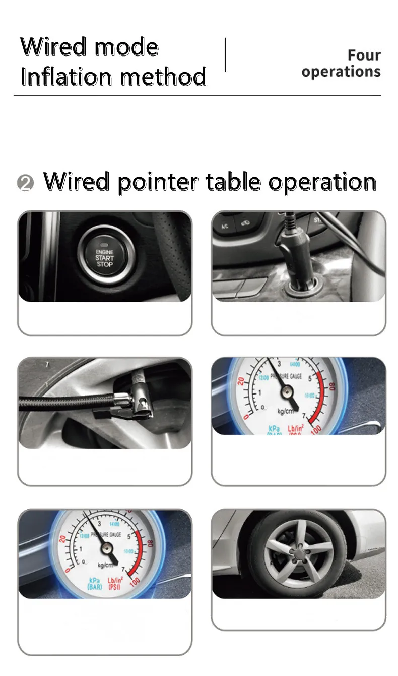 3. Во время надувания указатель инструмента поднимается с насыщением шин. Когда указатель достигает соответствующего давления в шинах (давление в шинах обычных автомобильных шин составляет 223кпа = 35psi), выньте штепсельную вилку и воздушное сопло для завершения работы.