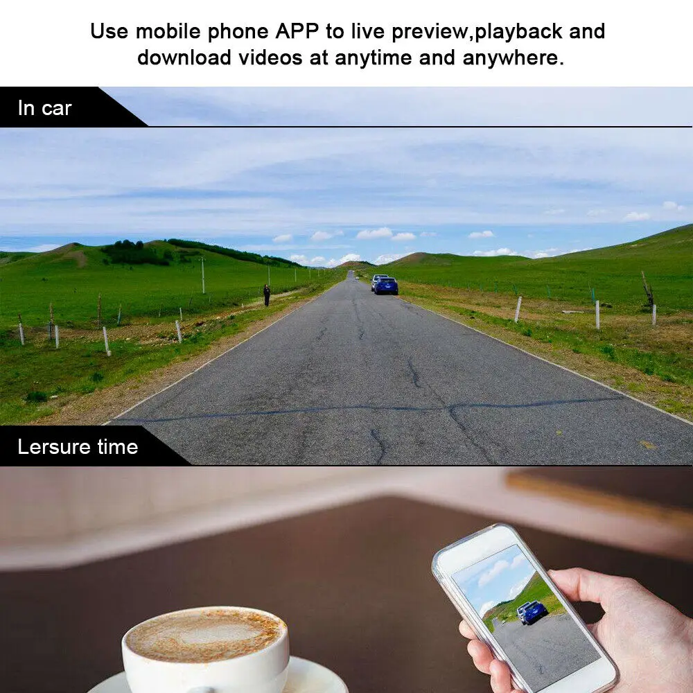 Предварительный просмотр приложения: подключает камеры для приборной панели на мобильный телефон через встроенный WiFi. Используйте мобильный телефон APP для просмотра в реальном времени, воспроизведения и загрузки видео в любое время.