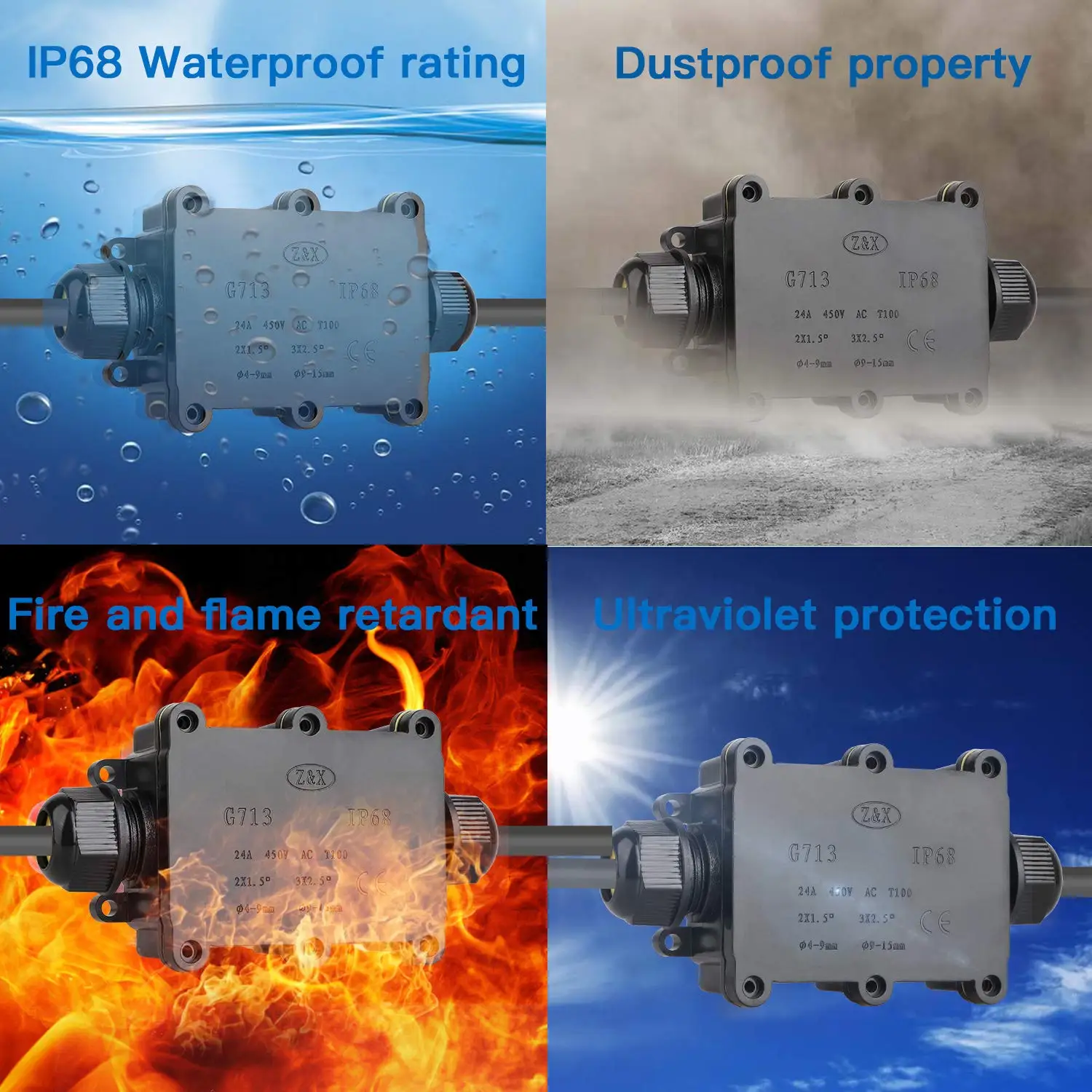 3.Класс водонепроницаемости IP68 высокого уровня/влагостойкий/пыленепроницаемый/анти-УФ пластиковый терминал, он может быть установлен как внешняя распределительная коробка, широко используется в открытых водонепроницаемых помещениях, уличных фонарях, похороненных огнях, садовые фонари, наружные прожекторы и т. Д.